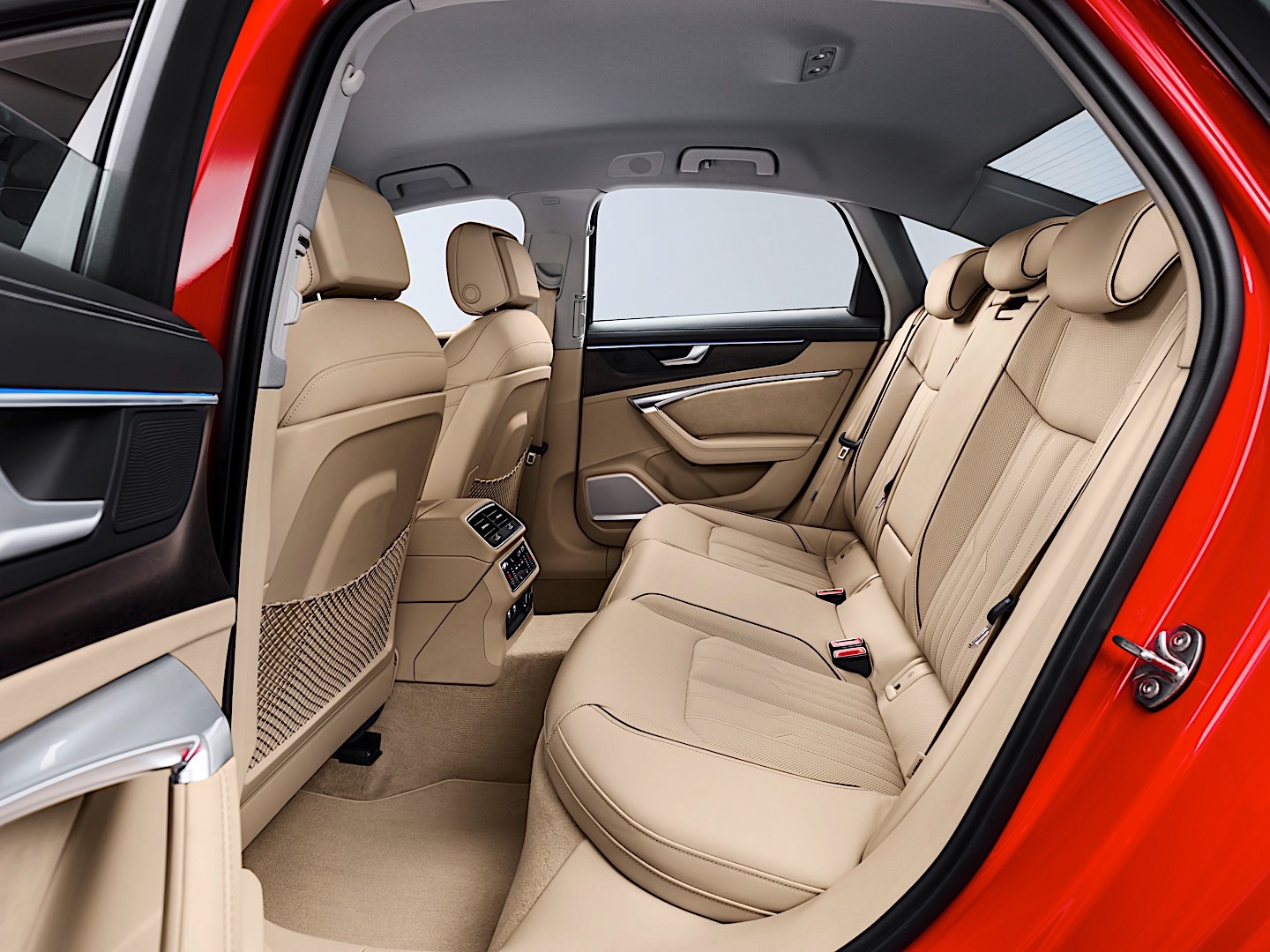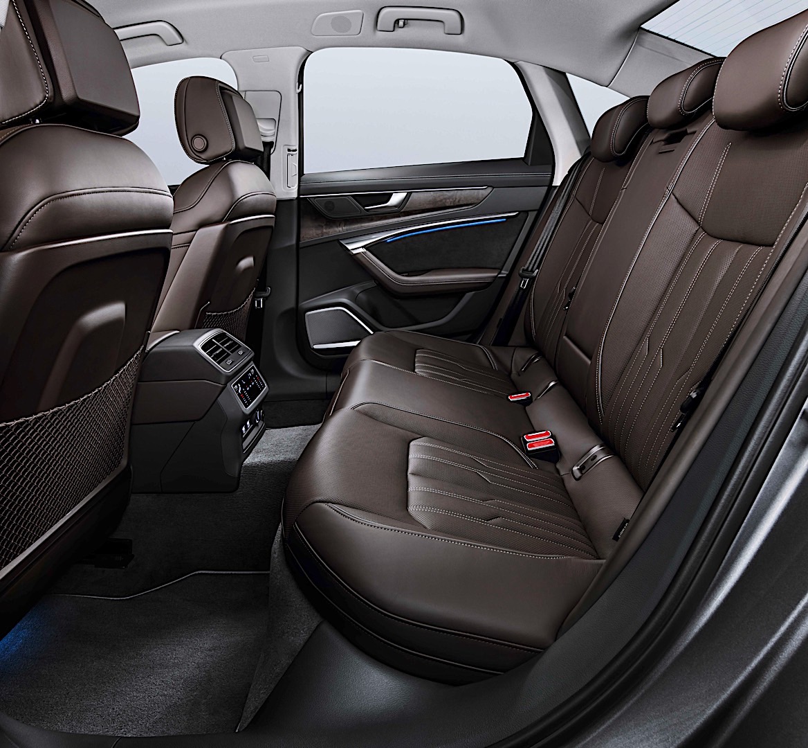 The biggest changes hide beneath the sheet metal. The interior is now dominated by glass and steel of sorts and it does look like it belongs in the 21st century. Inside we’re also dealing with an evolutionary approach, one that borrows almost everything from the A7 shown earlier this year. There are 30 different light hues available for ambient lighting and you can get optional ventilated seats in the back as well for the first time in an A6.