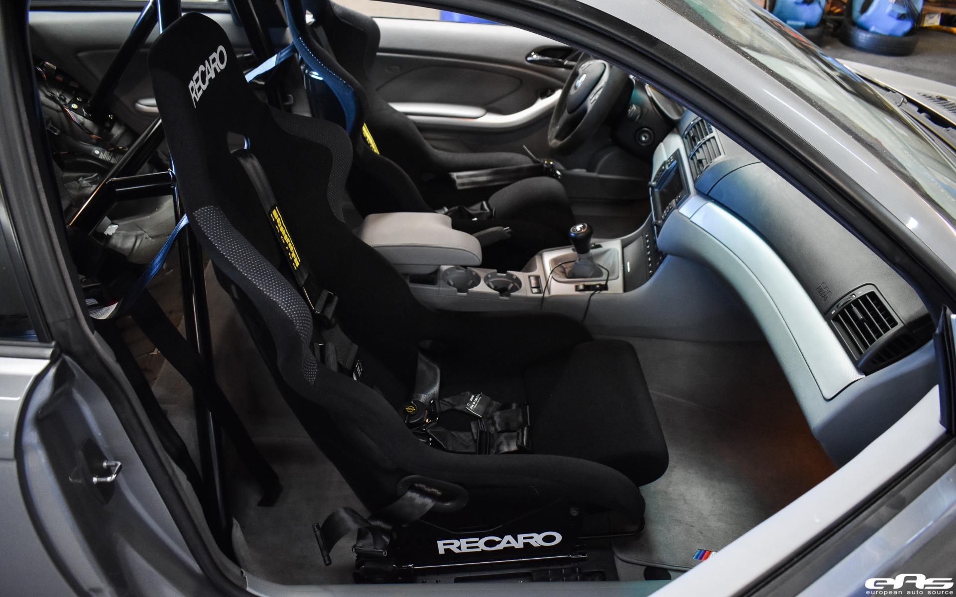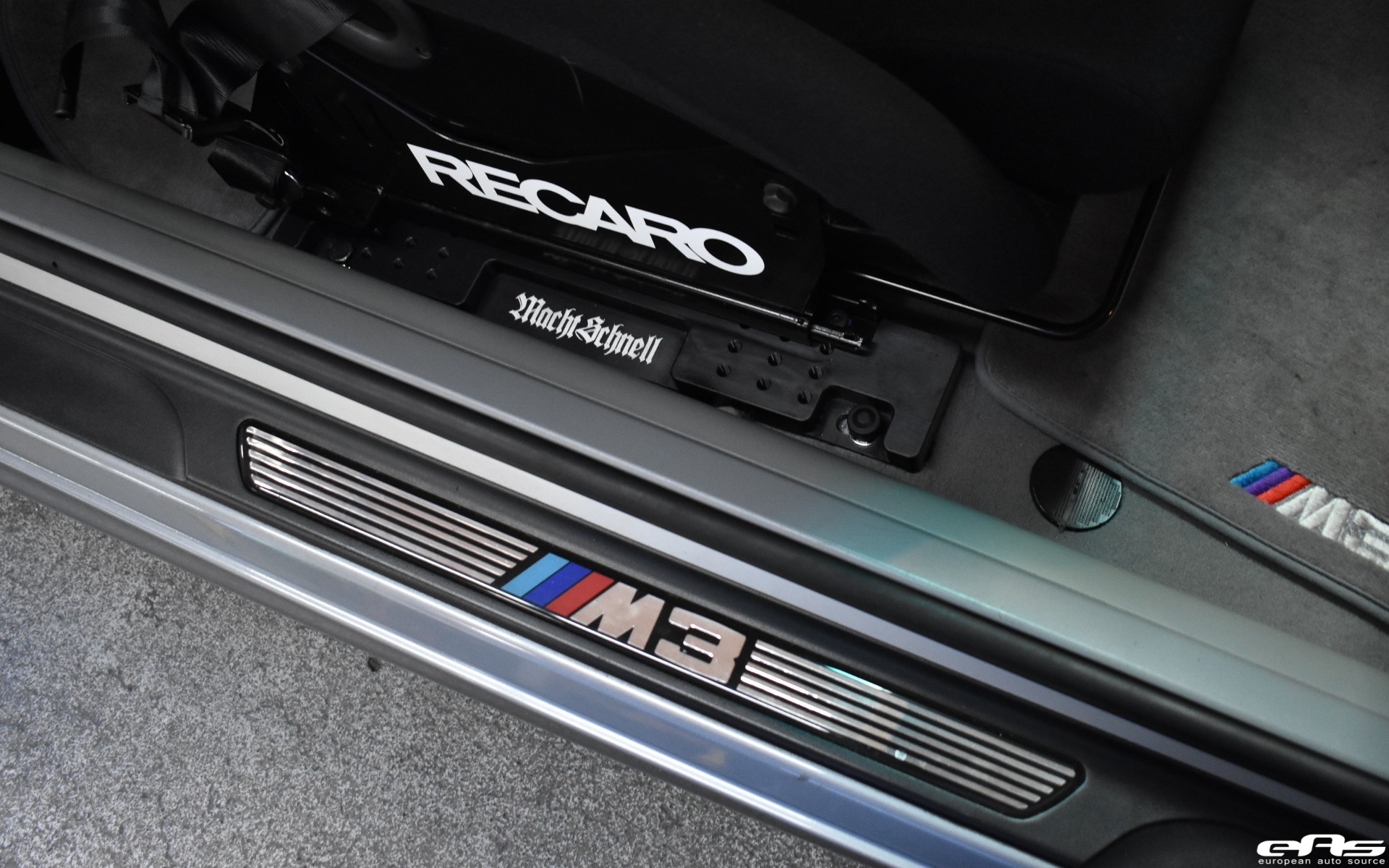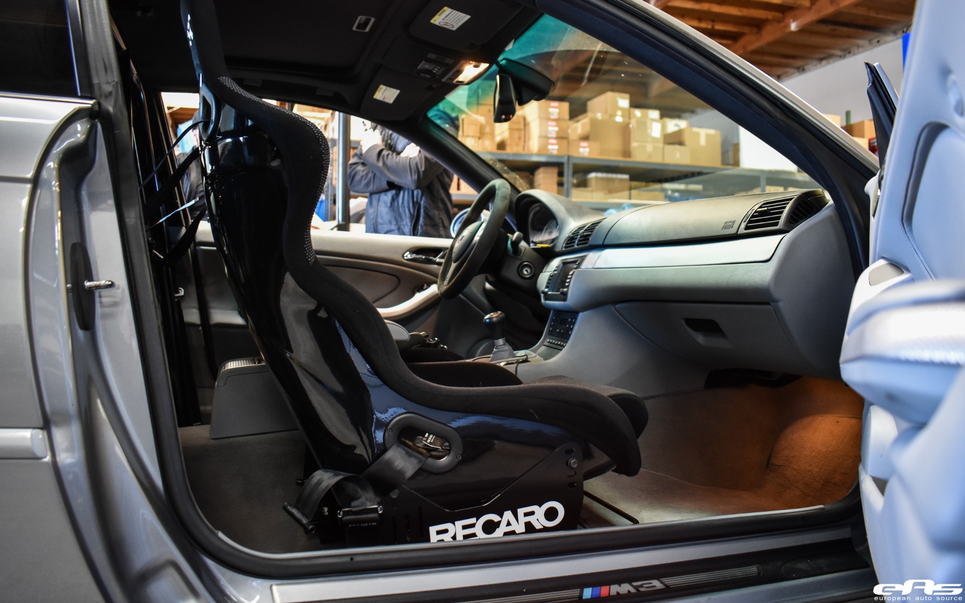 This particular Silver Gray BMW M3 was recently visiting European Auto Source. It was with this tuning company that the car received some much-needed track oriented additions. Namely, the owner wanted to improve his driving position by adding a set of bucket seats. The choice landed this M3 with a set of Recaro Profi SPG seats. These fixed shell bucket seats can completely transform the way a car looks and feels to drive. With rigid bolstering and the ability to sit in the seat, as opposed to on top of it, the driver will stay put under cornering.