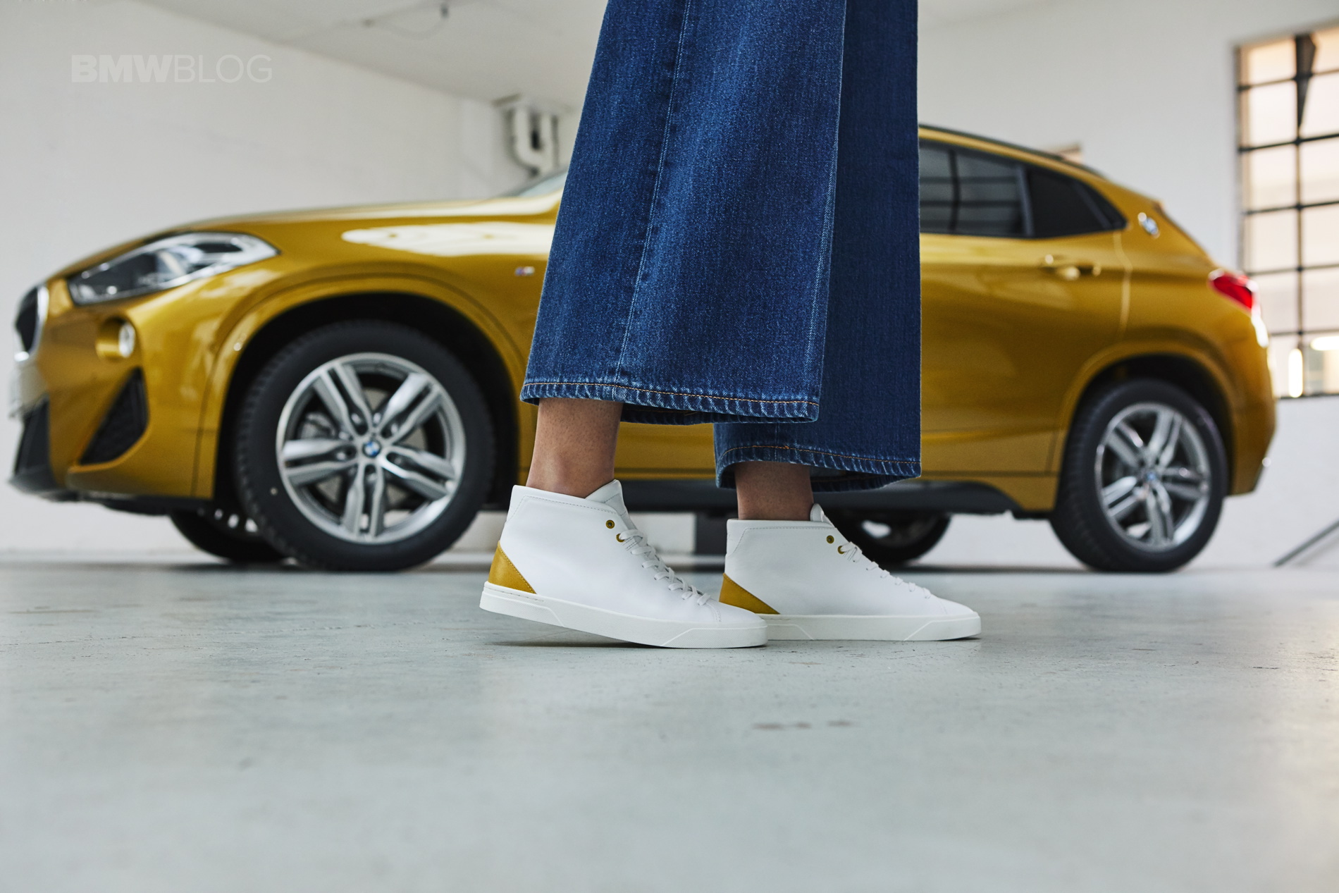 The white hightop sneaker feature a heel cap and eyelets in the Galvanic Gold, the positioning color of the BMW X2. There is also a subtle embossing with the word “X2” on the shaft end.