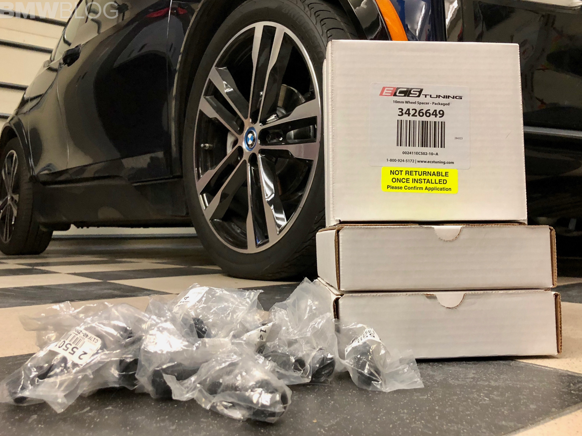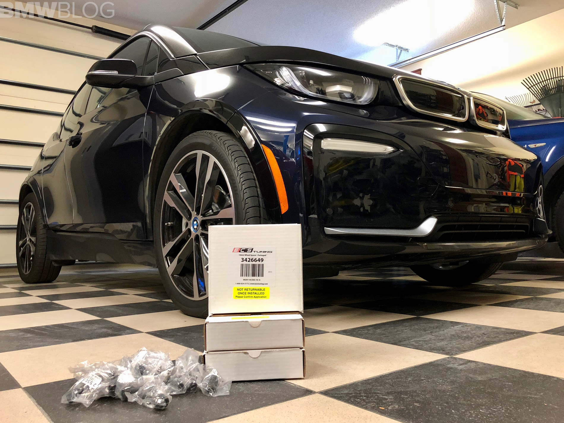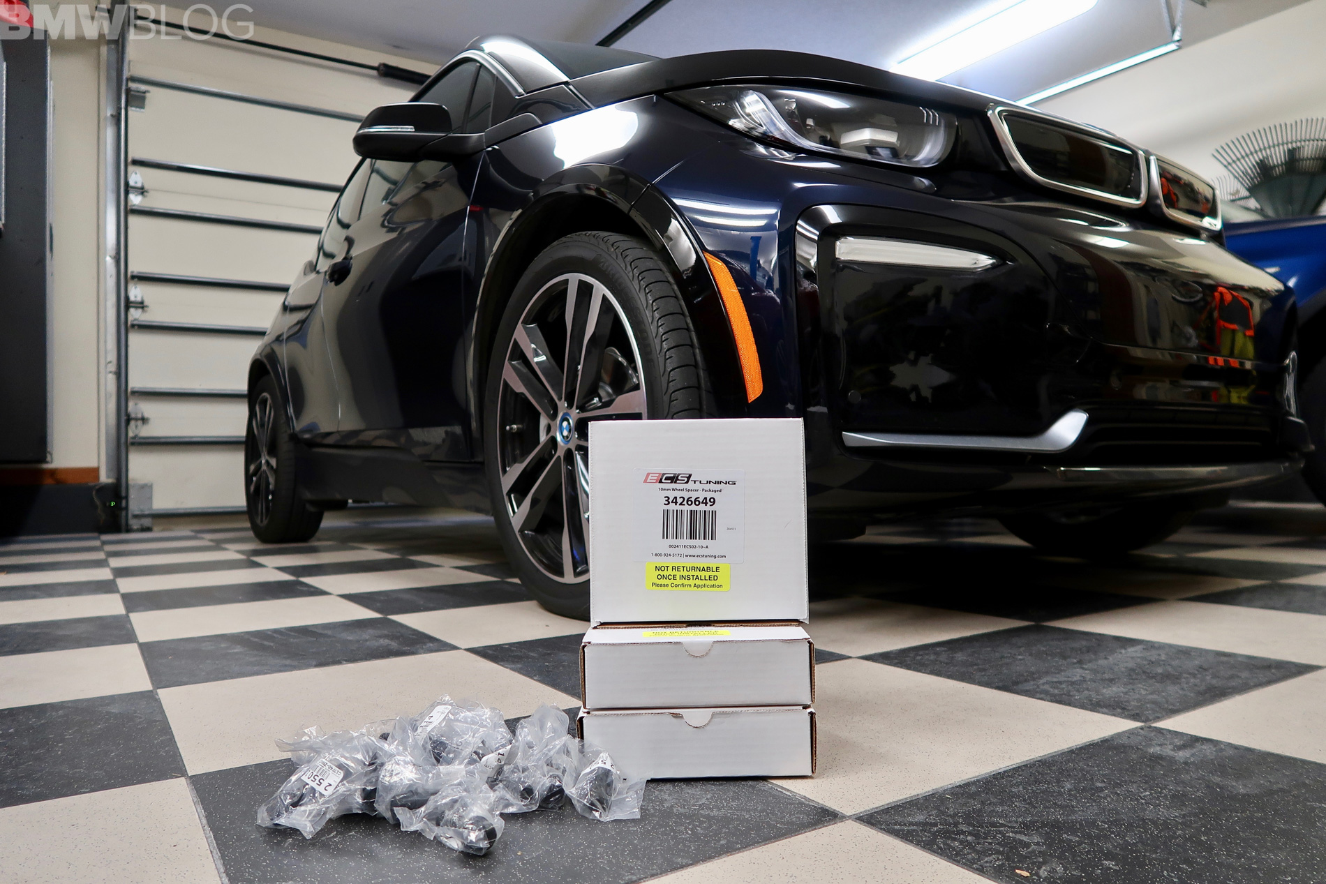 The reason that the regular i3 snow wheel set rubs is because BMW used a 10mm wider offset in the front and 15mm in the rear to help them achieve the 40 mm of increased track width for improved handling. This unique offset on the i3s is why our dedicated 19 inch Rial wheels and snow tires we used on our 2014 i3 wont work. We managed to overcame all these issues, with, drumroll please, spacers from an aftermarket tuner, ECS.