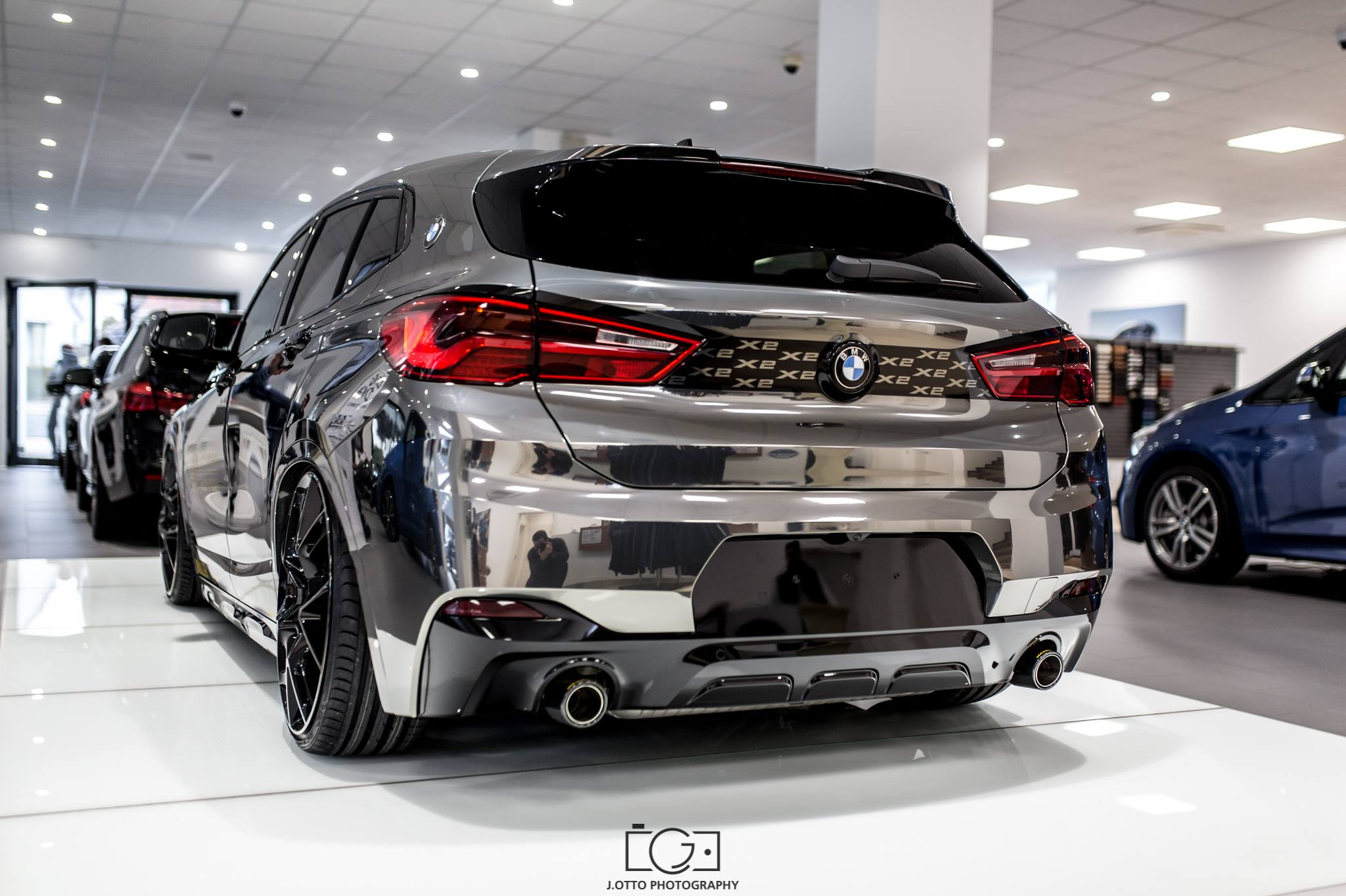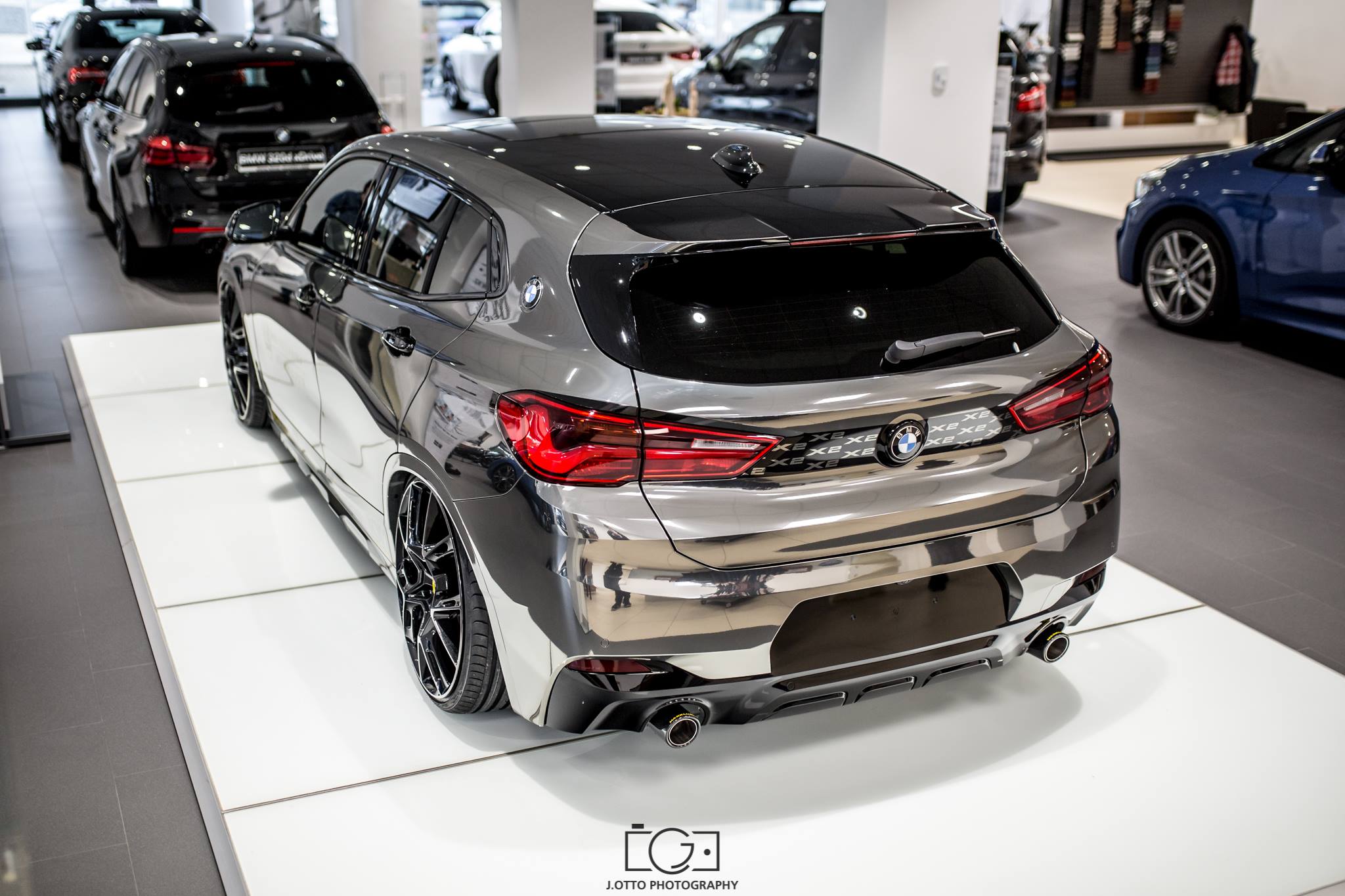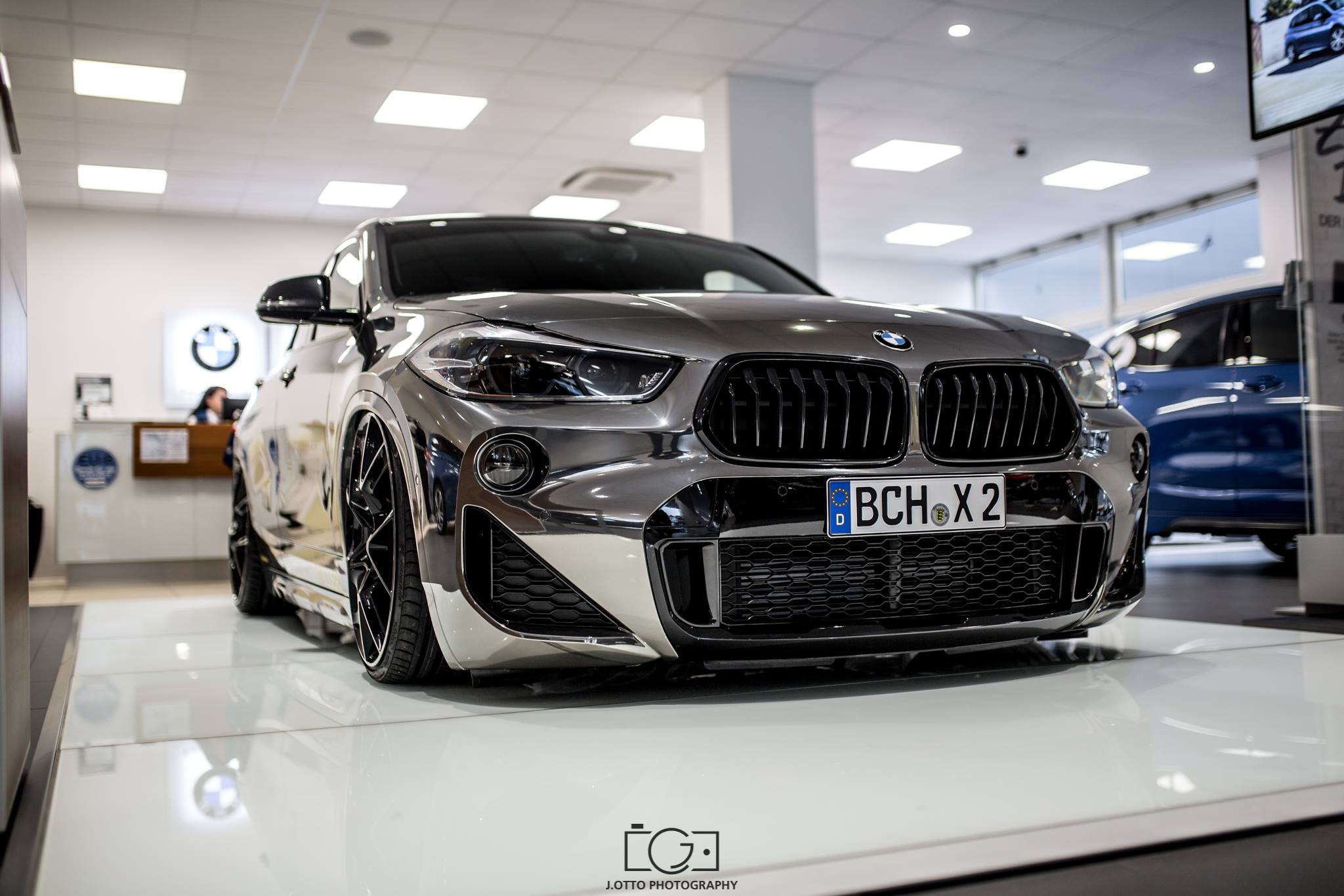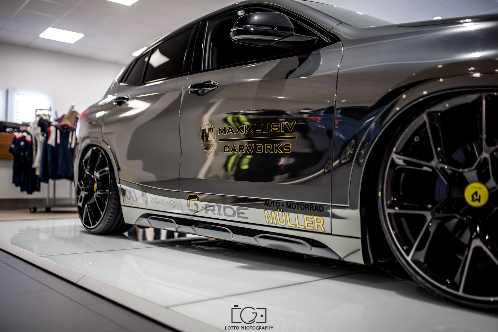 Just in time for the dealer premiere of the new BMW X2, the car dealership Müller in Buchen Hettingen was also able to present the first tuned model. Responsible for the project is the Maxklusiv GmbH, which has extensively revised the lifestyle SUV. Two changes stand out immediately: the paintwork covered by a full wrap in black and chrome, and the extremely low stance.