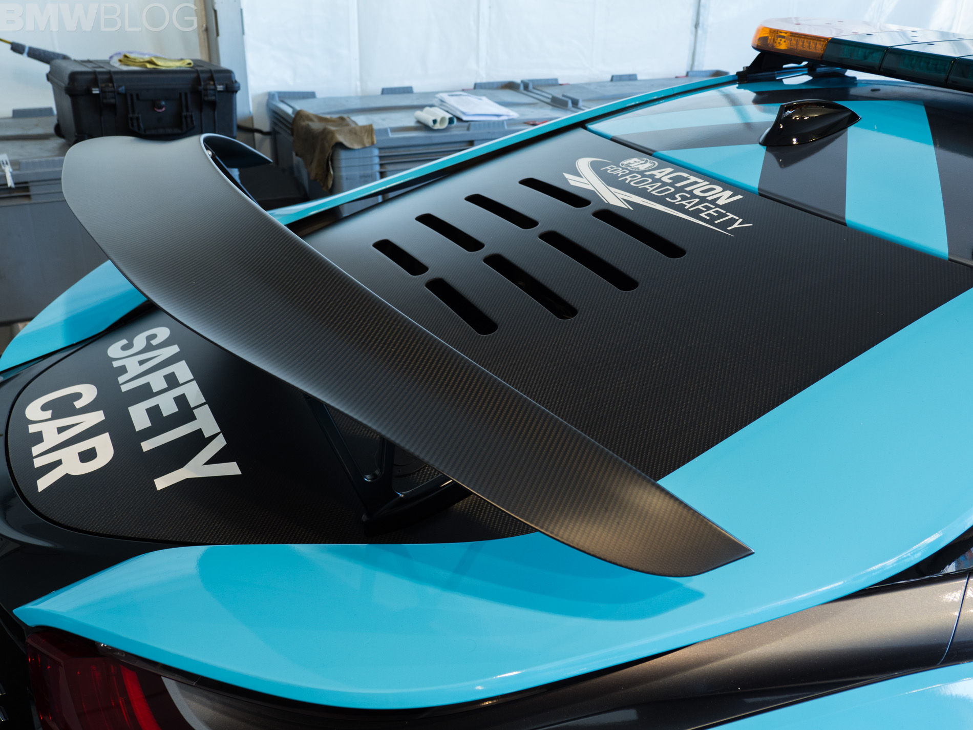 The extravagant rear wing is mounted directly on the carbon cover which has always been installed on the safety car instead of the standard rear window. Under the additional ventilation openings, two large fans are placed, which help regulate the inside temperature.