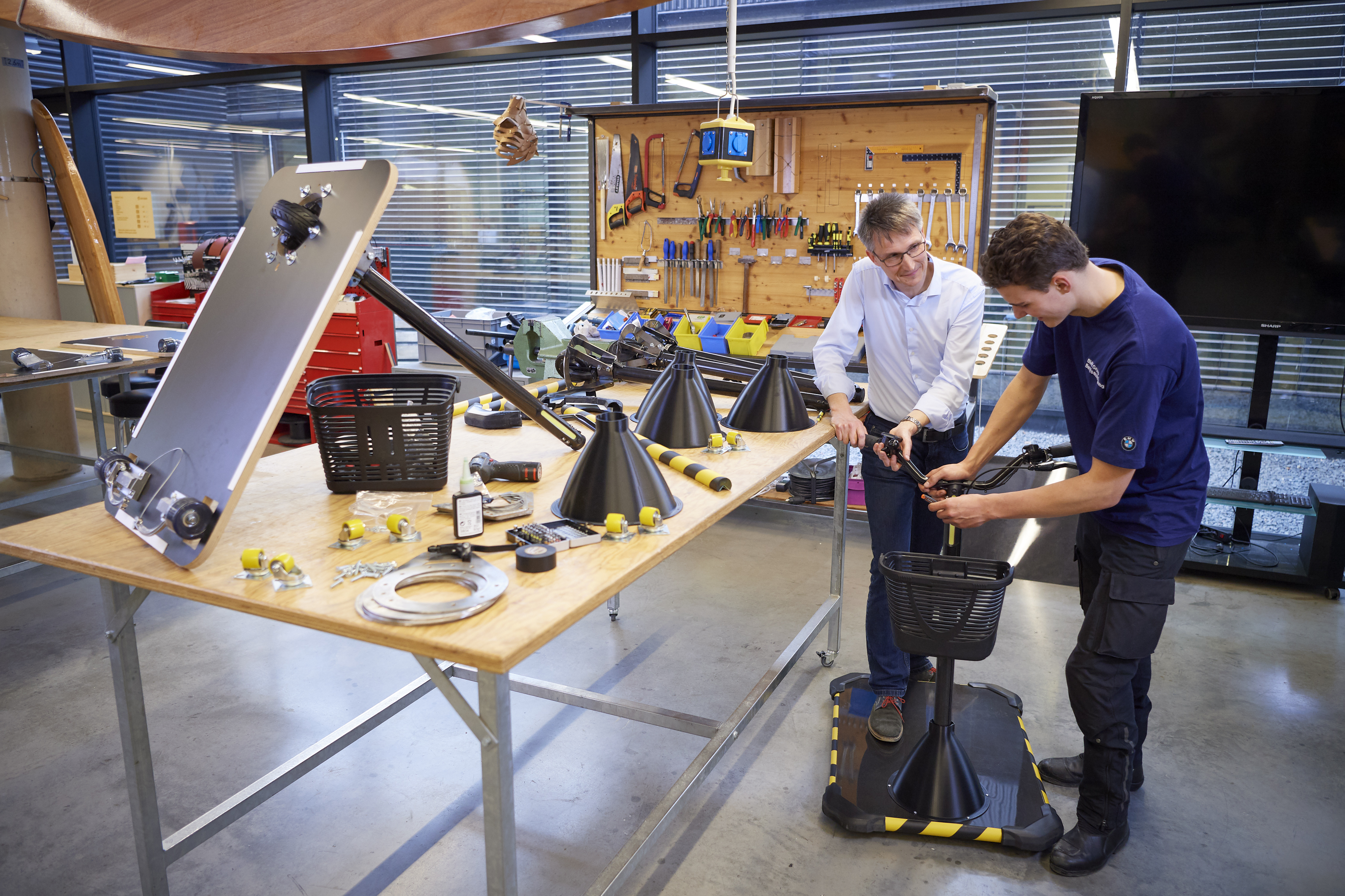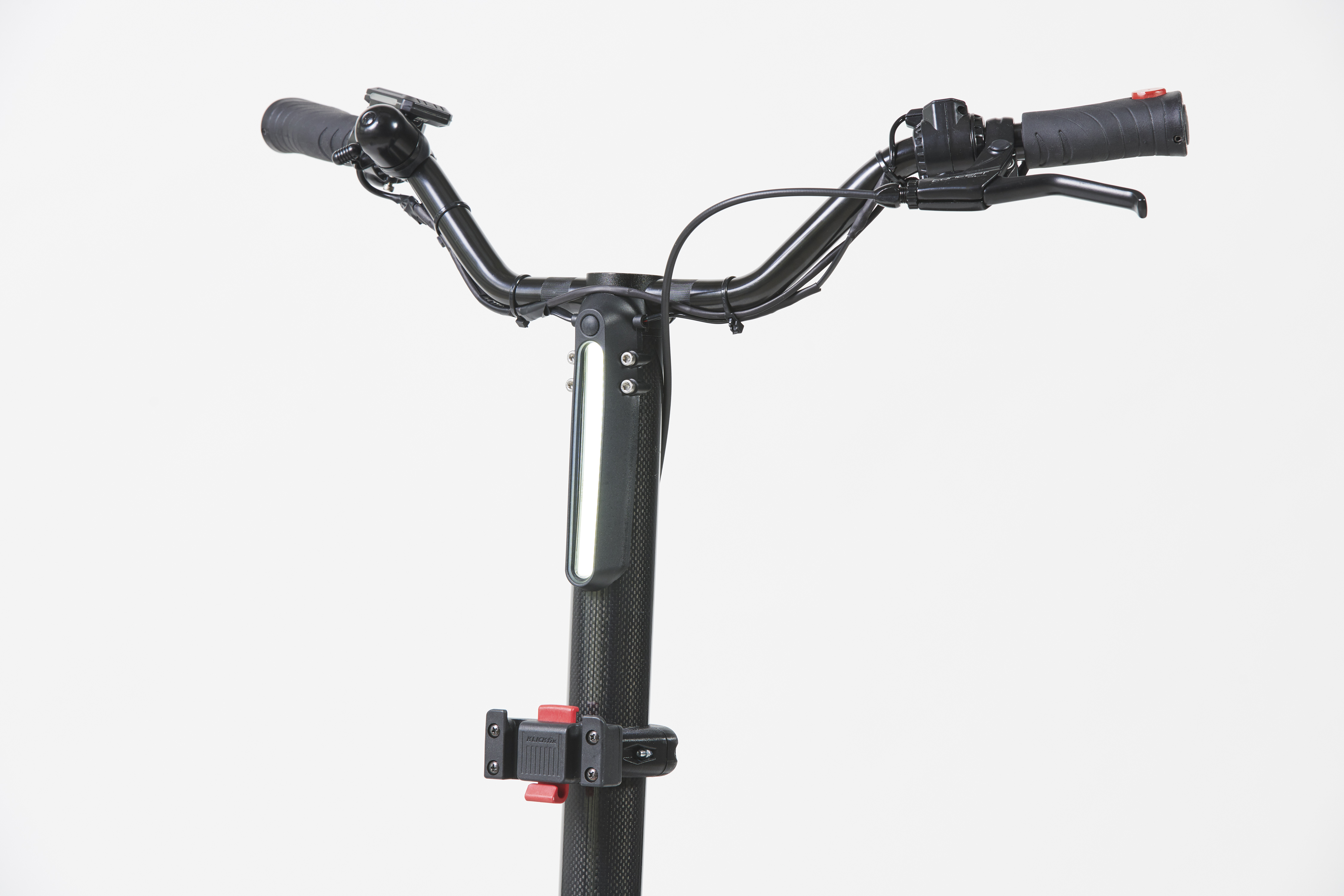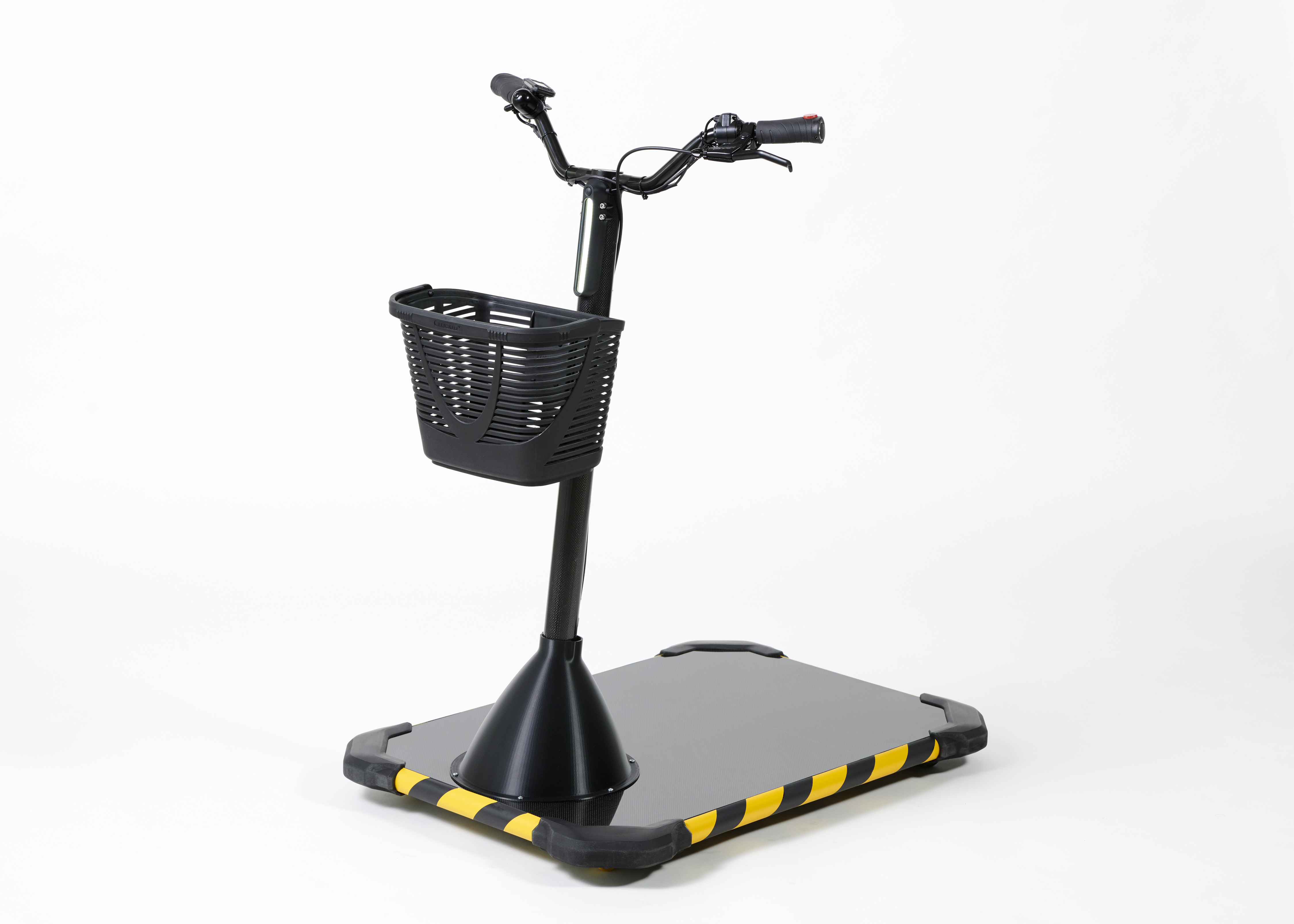 The handlebar contains the entire electrical system, the battery and the drive wheel, and can be rotated 90° to the left and right, allowing the Personal Mover Concept to turn on the spot. A thumb throttle for regulating speed is integrated into the right grip. This control is used to start the Personal Mover Concept, switch the light on and off, select the driving mode or check battery status. For safety, there is also a bell for warning other employees. The left grip operates the brake and a dead man’s control.