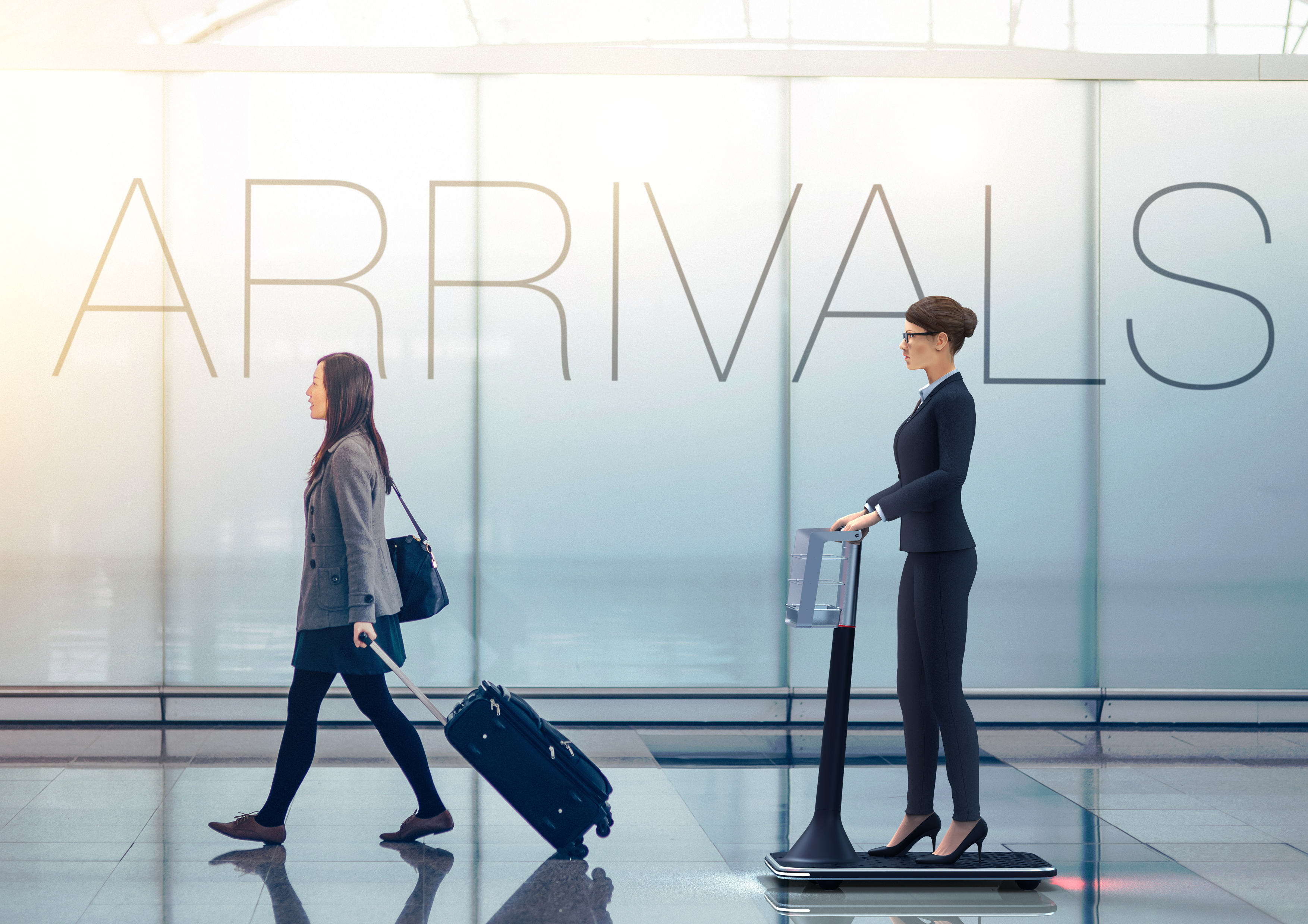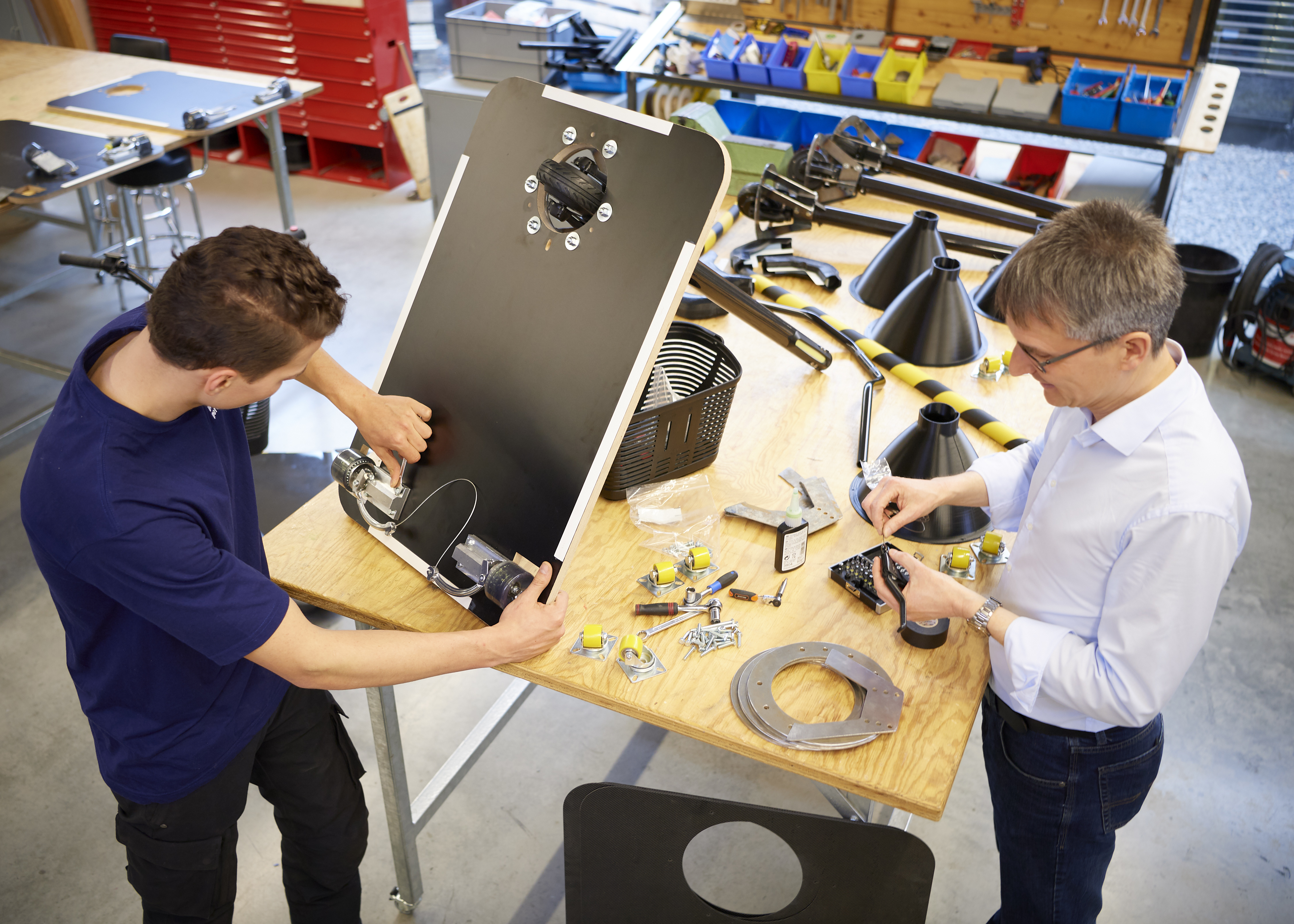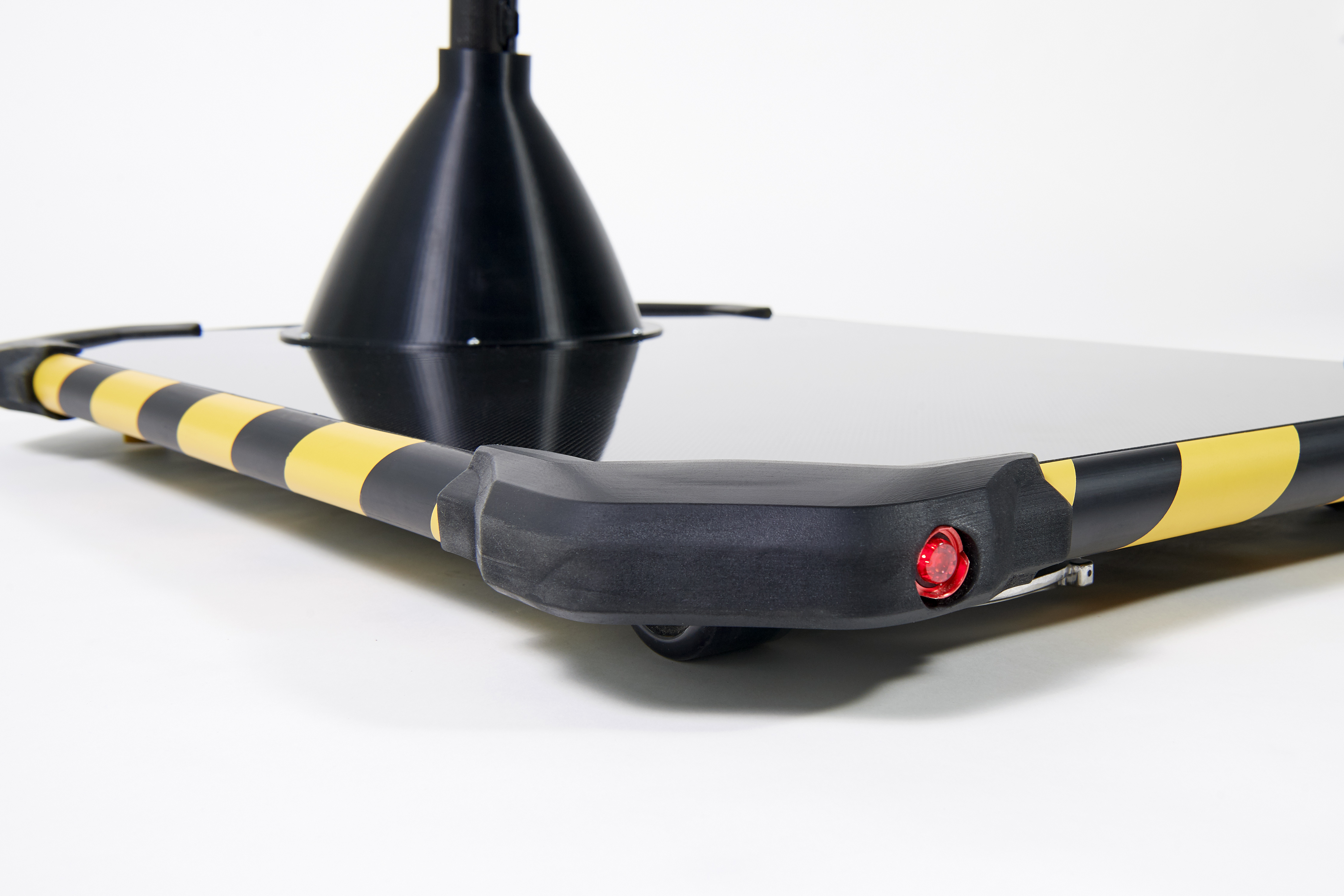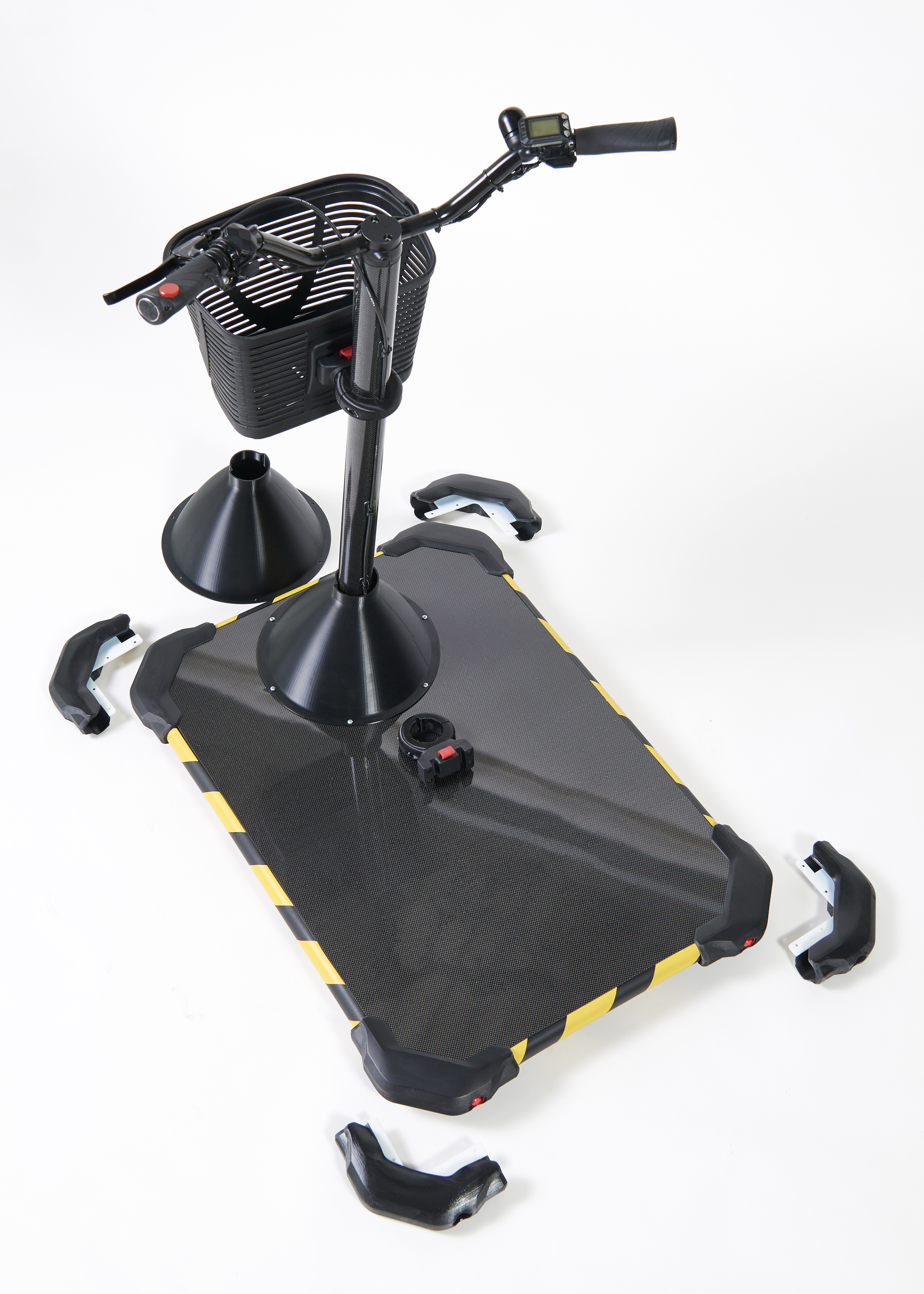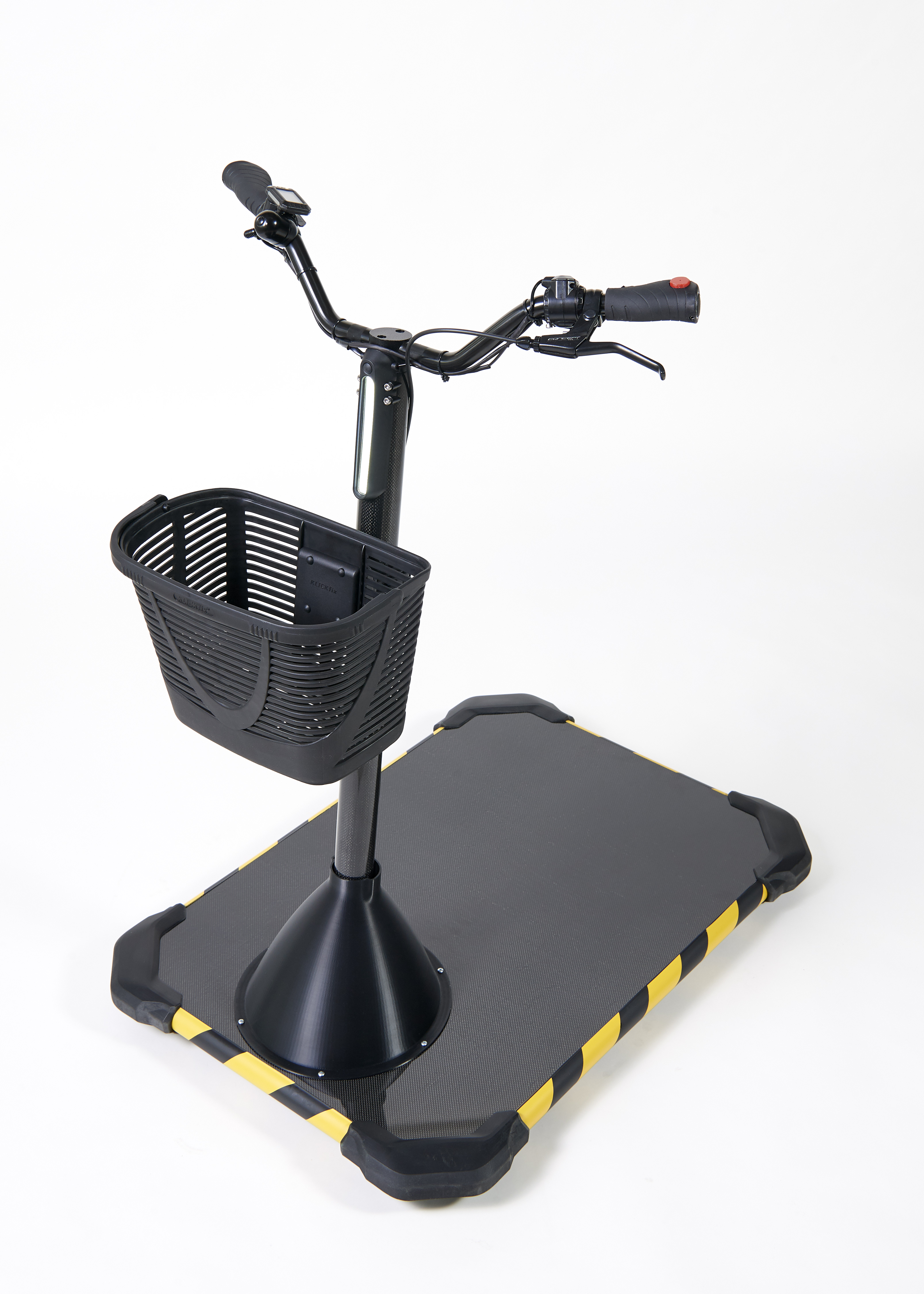 The body platform of the Personal Mover Concept is 60 centimeters wide and 80 centimeters long, so that a person can stand comfortably on it and still have room for larger, heavy objects. Two wheels at the rear corners of the platform and two support wheels at the front ensure that it does not tip over, even in tight bends. The two front support wheels rotate 360°, which greatly increases maneuverability. The handlebar and drive wheel are sunk into the middle of the body platform at the front.