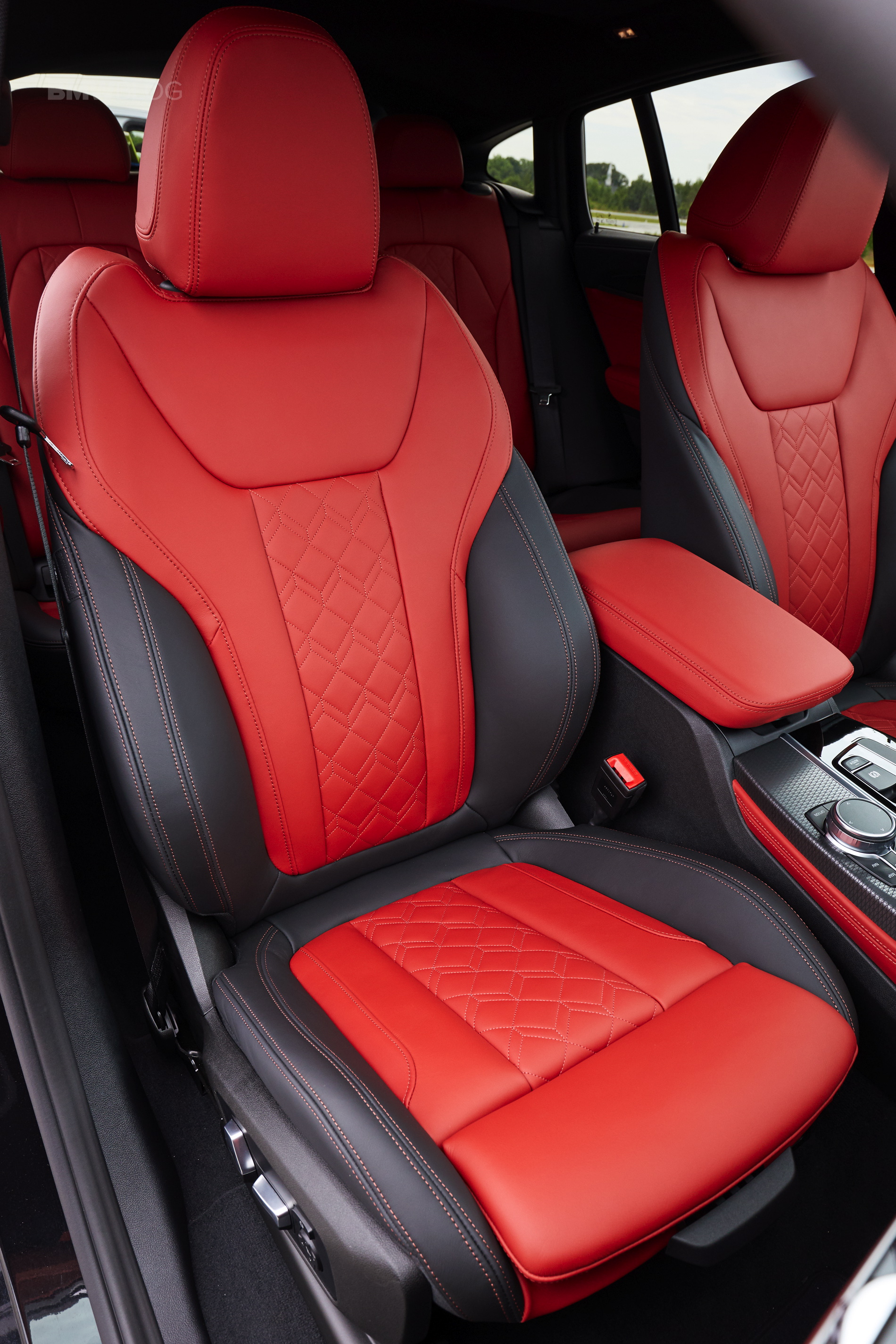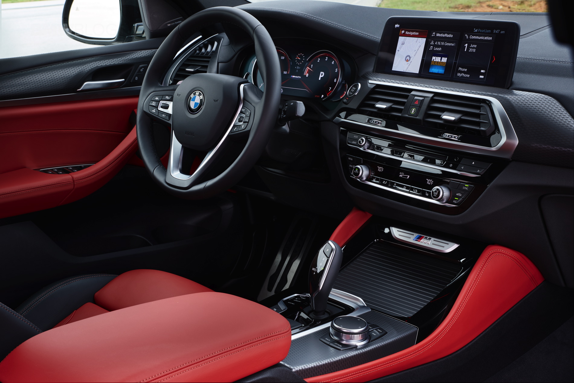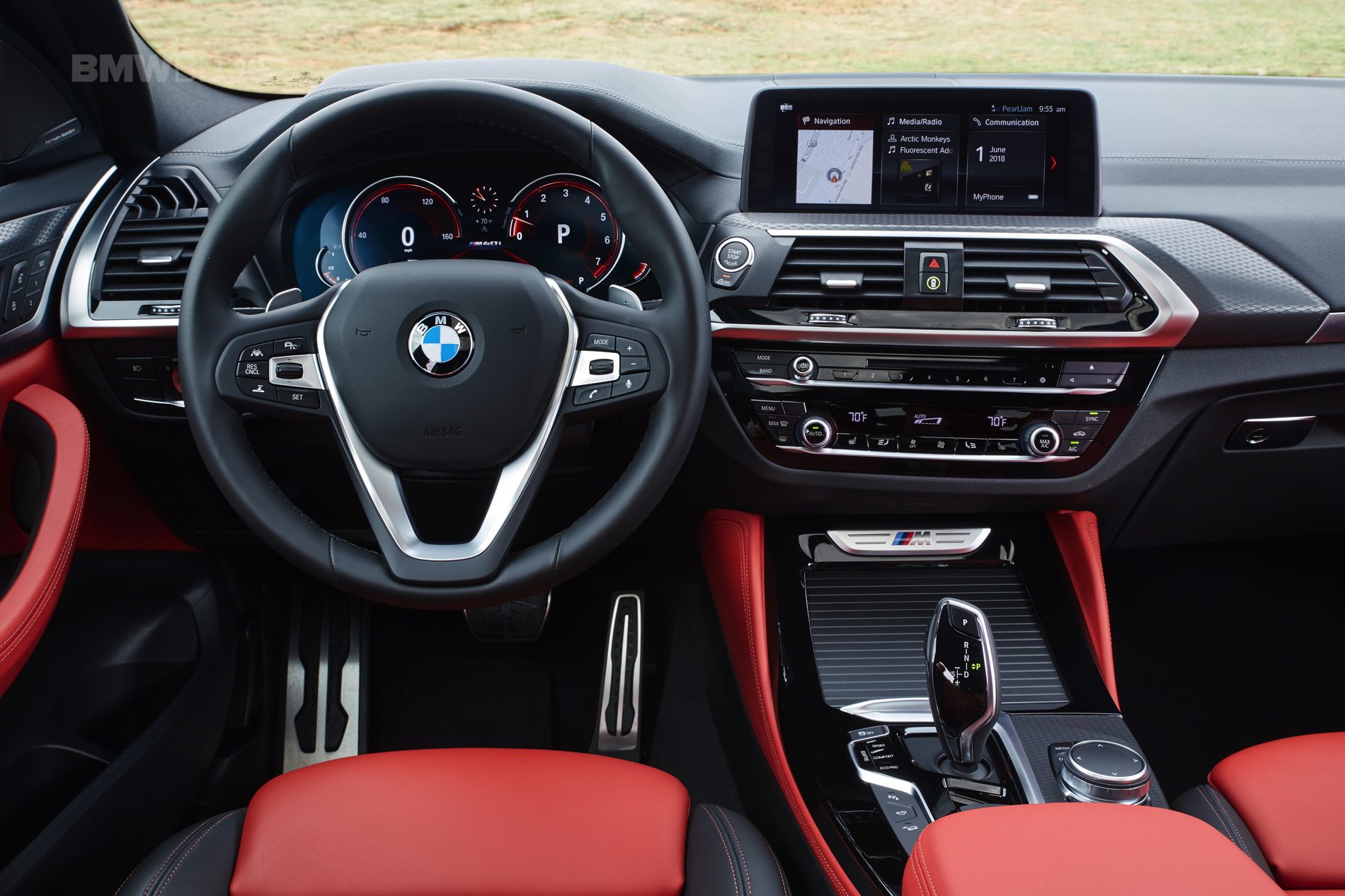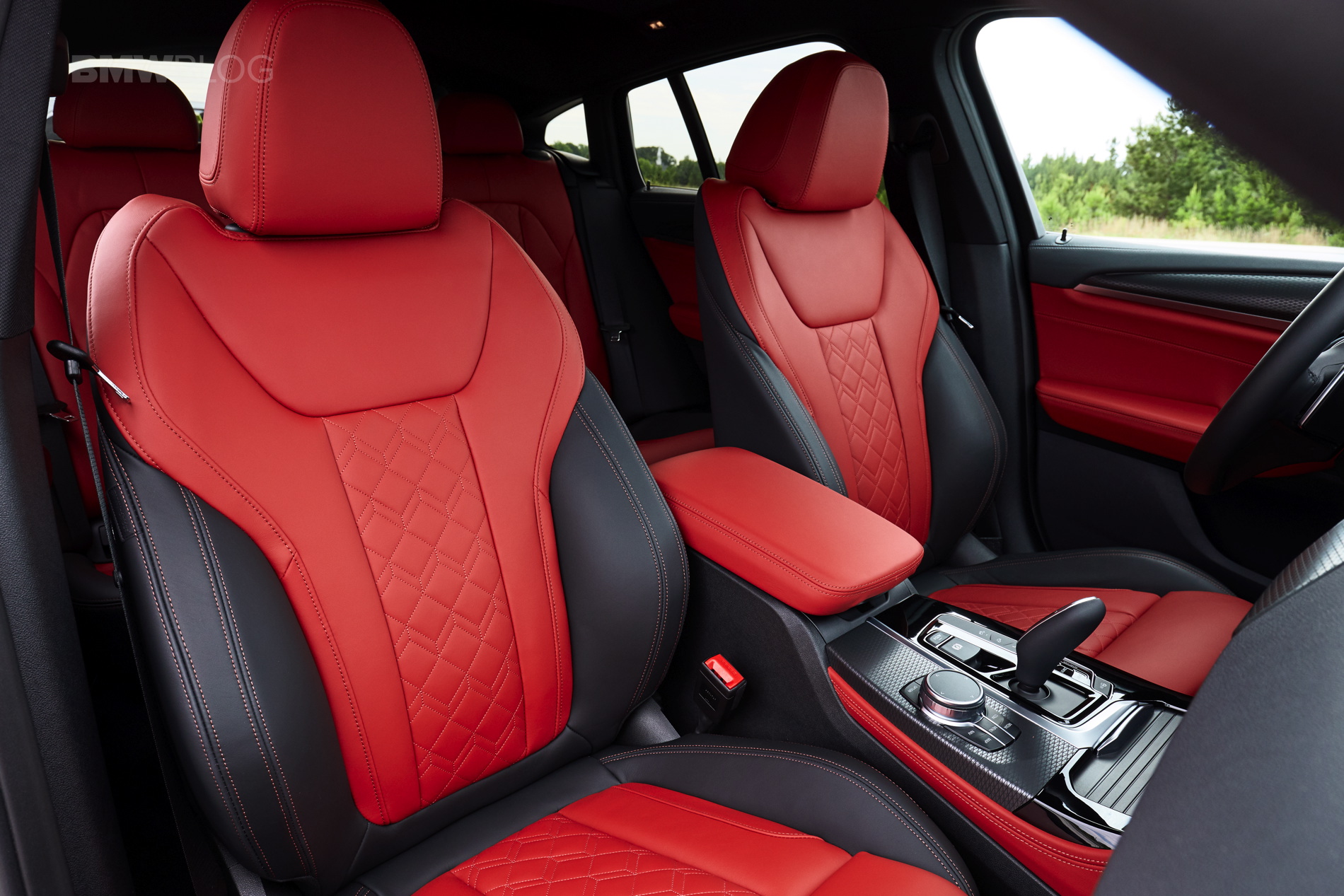 Inside is where the first X4 shows its age, and while the new generation G02 X4 follows on the steps of its X3 brother, the quality of finishes and materials inside the cabin is what stands out immediately. It’s also better looking, and it can be had with BMW’s Individual treatment. The sport seats are standard on the X4 M40i and there is also a new optional Vernasca leather. There’s also a new color option, Tacora Red, as well as black leather available with either blue or red contrast stitching. Unfortunately the car we drove lacked the Sports Steering wheel which according to BMW is stuck in the regulators’ purgatory and will arrive in the future.