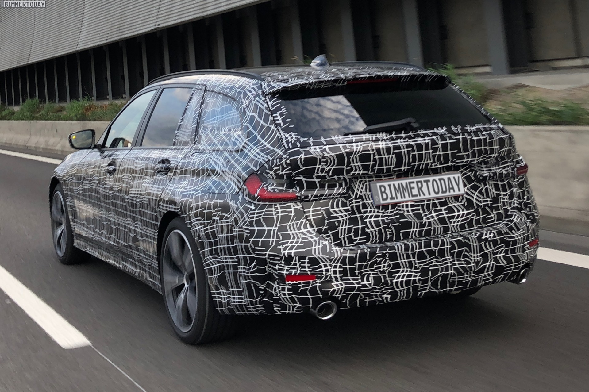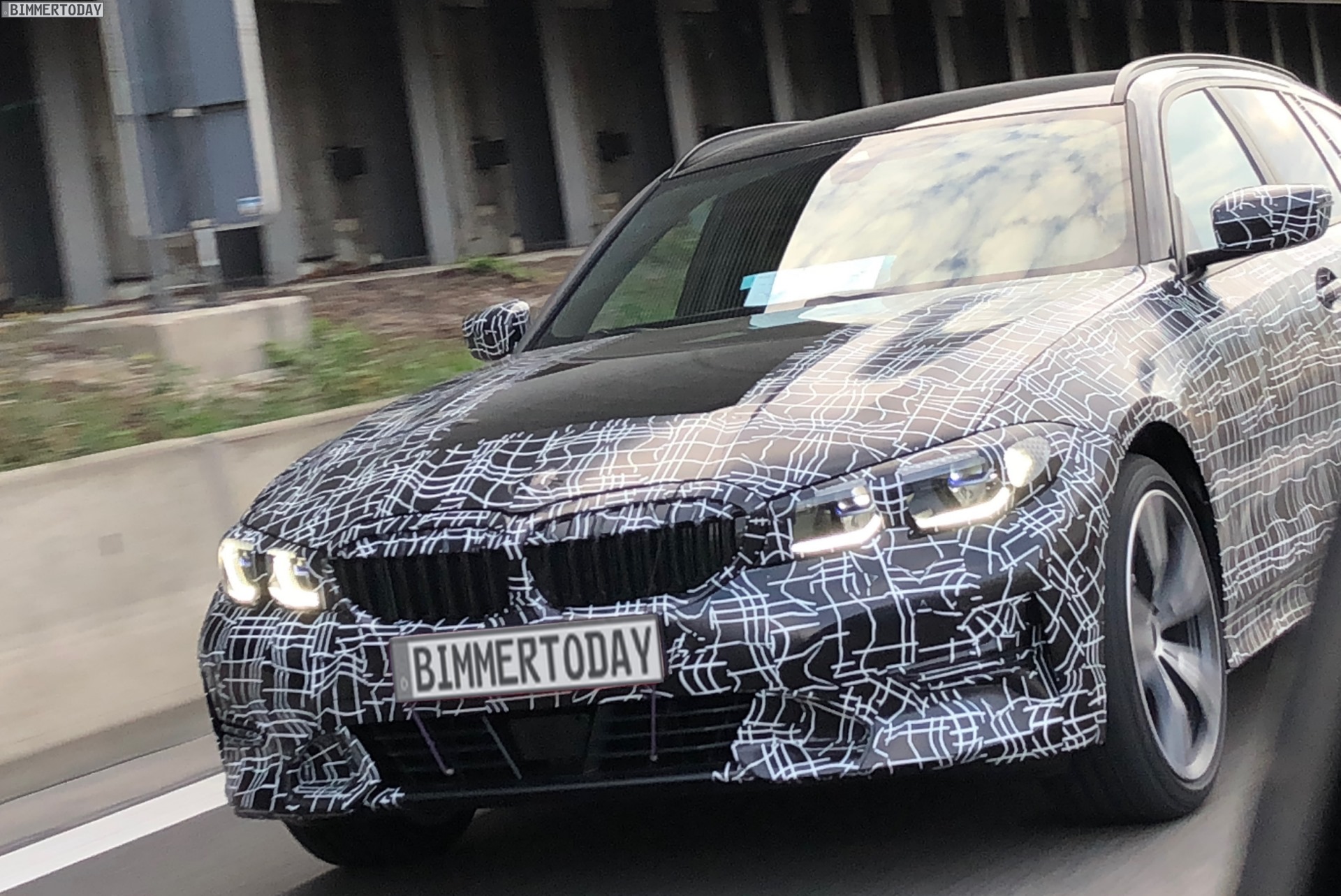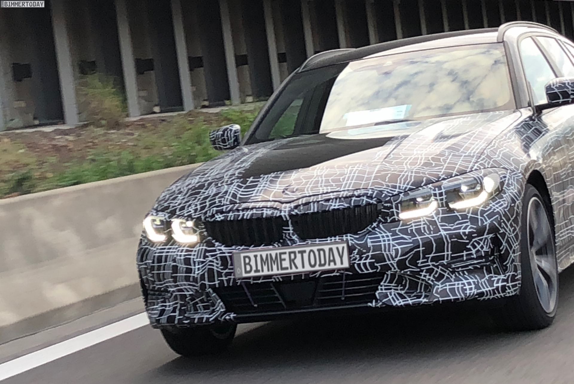 Just a few months after the G20 3 Series sedan, the new BMW 3 Series Touring G21 will also celebrate its market launch. Bimmertoday’s reader Bobby has caught a test mule of the mid-range sports wagon on the Autobahn near Munich giving us a closer look at the athletic touring. Despite the camouflage, some details are clearly visible, including the directly interconnected mono-grill kidneys, and the shape of the headlights and taillights.