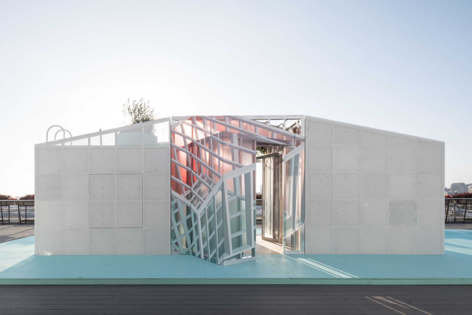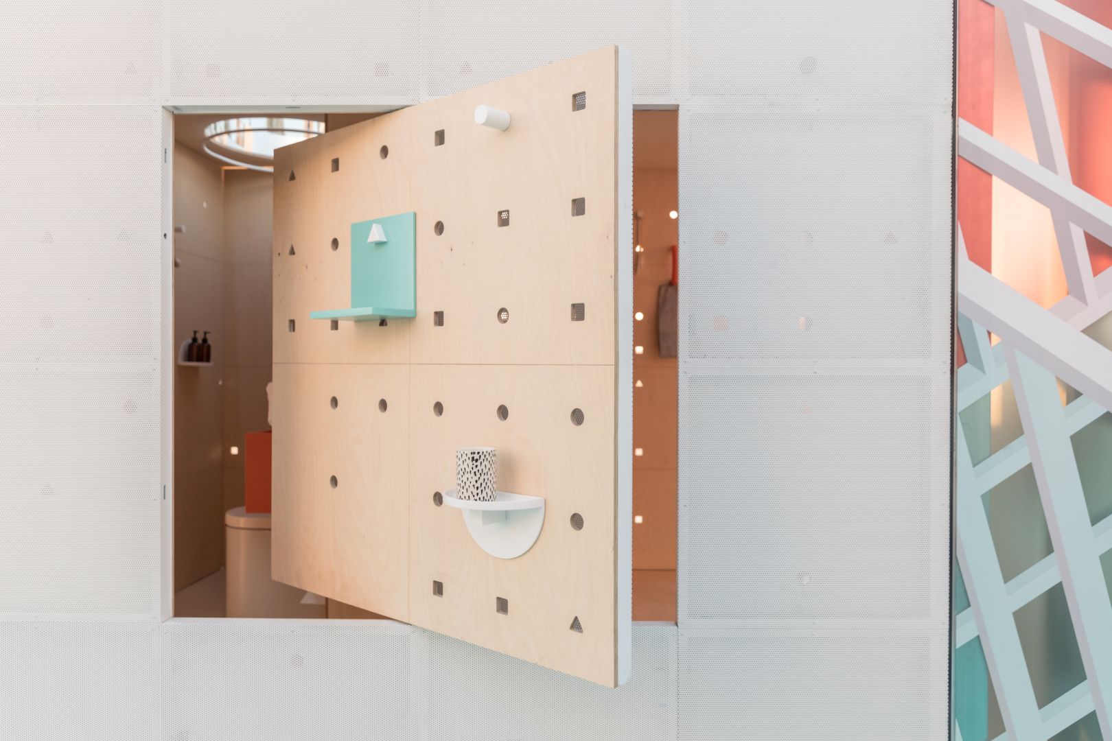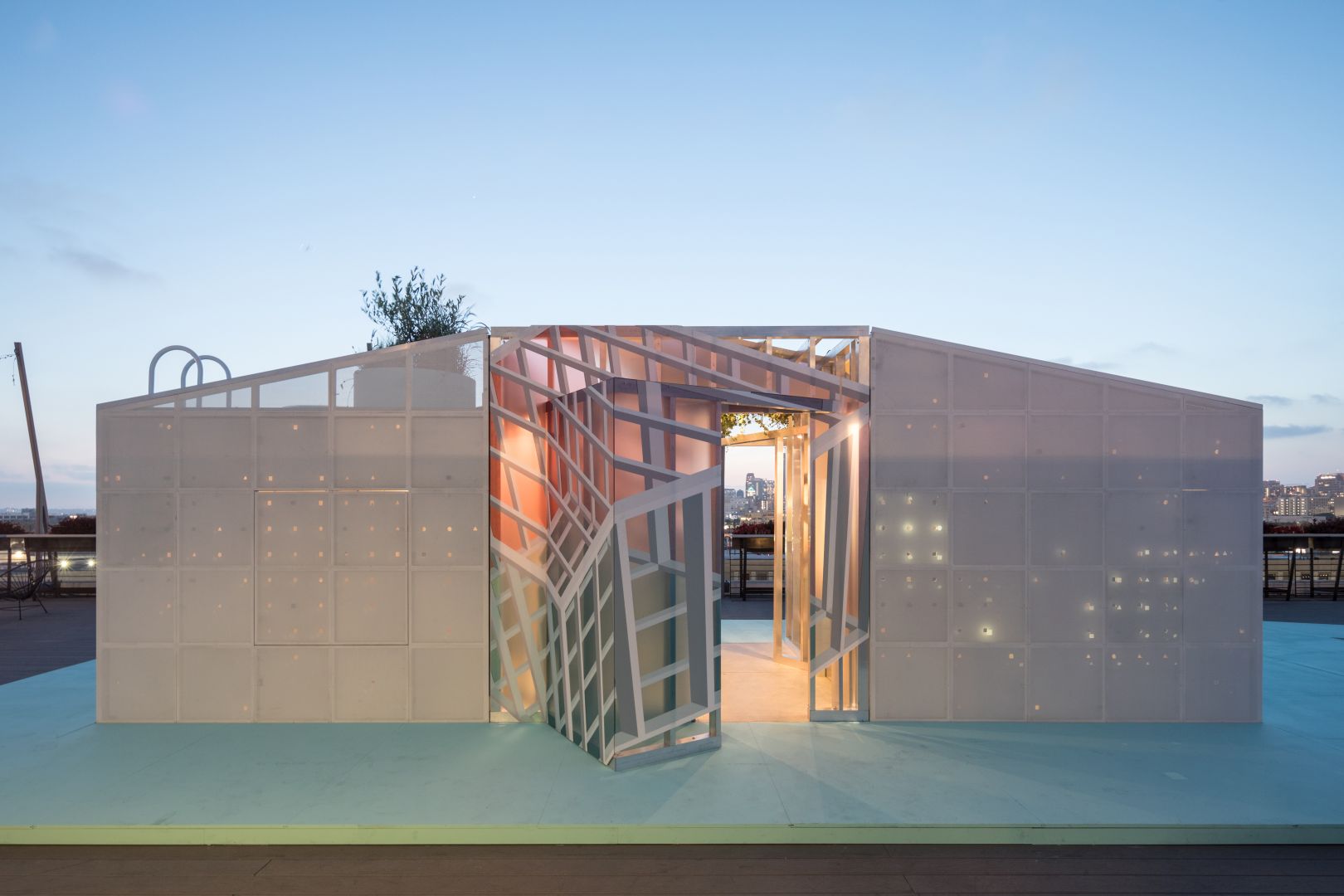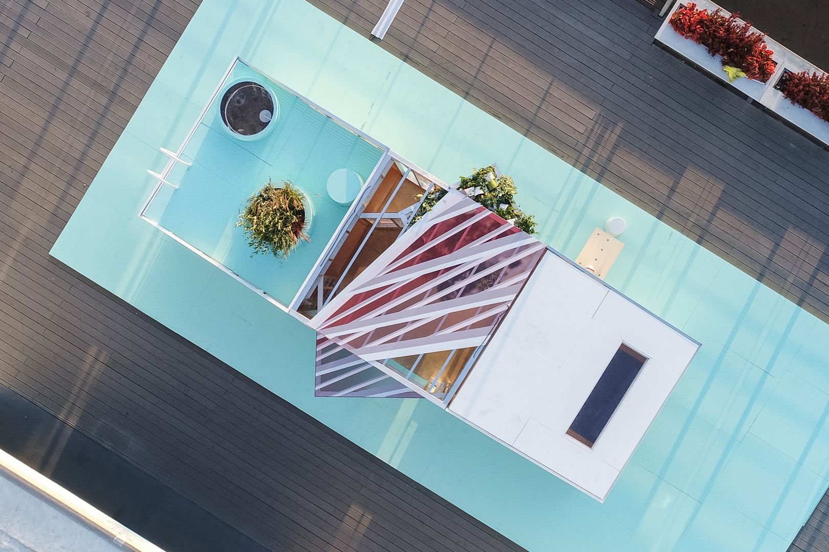 Therefore, the MINI Living Urban Cabin in LA addresses this in a downtown setting by providing an urban oasis. In the cabin’s experiential space, architect duo FreelandBuck from Los Angeles created a hanging garden along with perforated areas to let in plenty of air and light. The duo also designed two nested cubes that produce a kaleidoscopic visual effect. The result is an atmospheric interplay of light refraction and visual illusions. The outwardly protruding hanging garden combined with this suggestive play of light conveys to visitors the sense of being in the countryside – even though it is in the middle of the city.