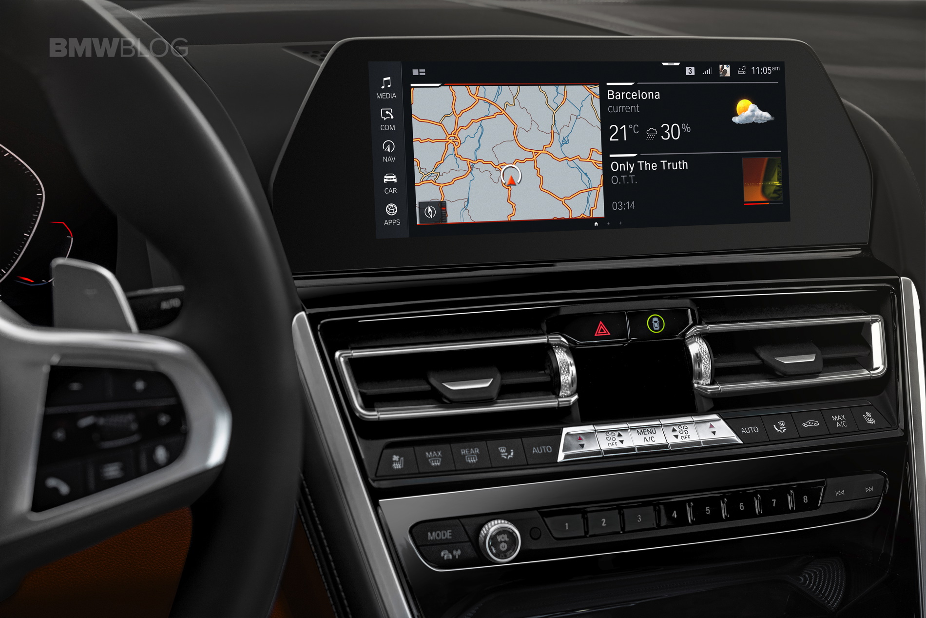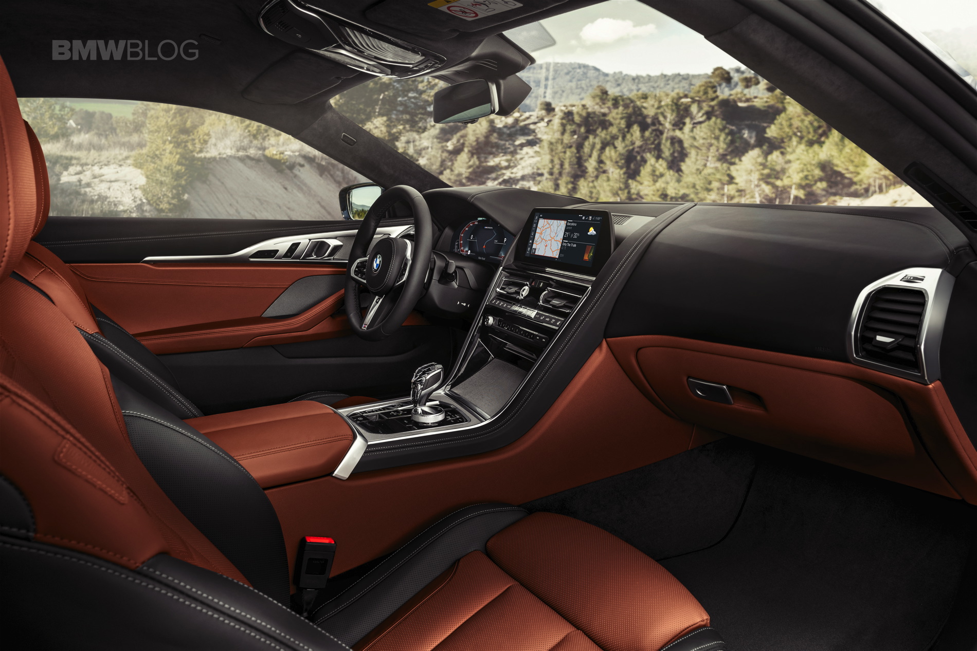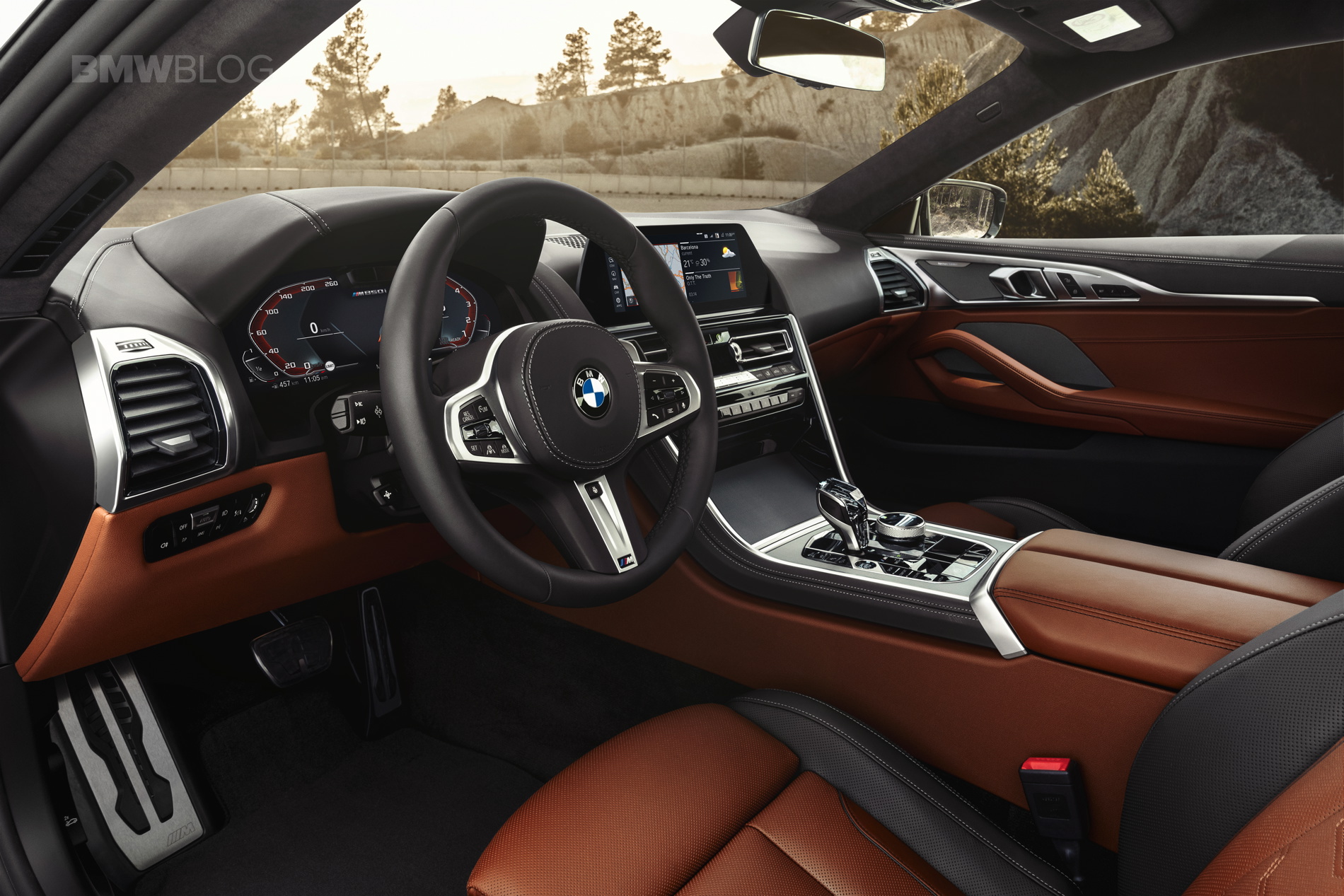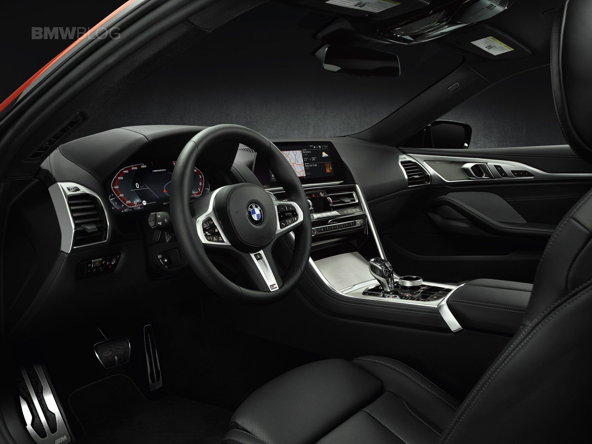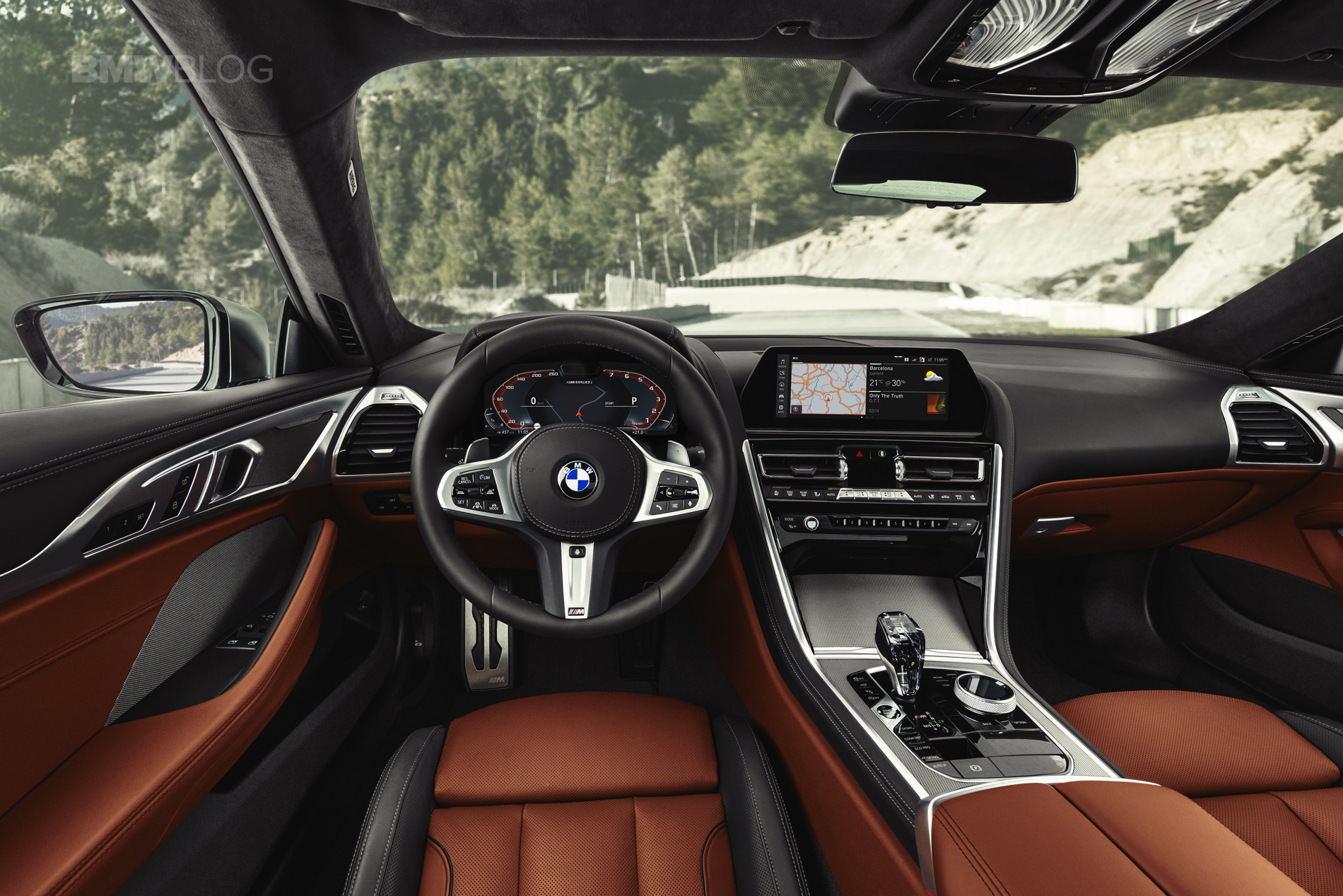 Atop that waterfall stack lies the new 12.3-inch iDrive screen that features BMW’s latest iDrive 7.0 technology. The screen is touchscreen compatible but iDrive retains a physical rotary control dial on the center console. That rotary dial is also new, with a knurled aluminum rim that looks far more premium than the current plastic one. Much like the new BMW X5, the 8 Series features a Start/Stop button on the center console and a new shift lever which is made from crystal.