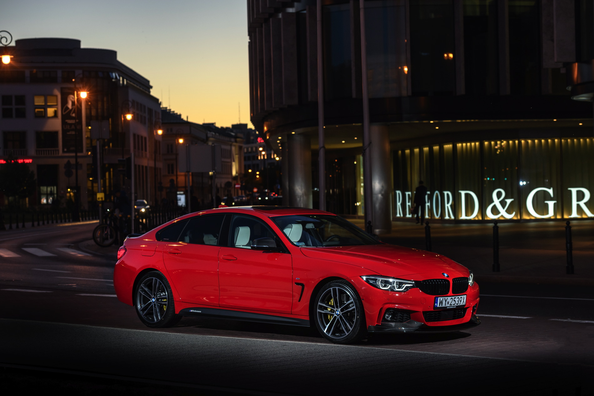 In these photos from Poland we see the BMW 4 Series Gran Coupe with M Sport Package in a bright red color. Various tuning components from BMW M Performance add dark accents in high-gloss black or carbon fiber, and make the four-door coupe appear even more confident. These photos also emphasize our previous statements: This four-door coupe is a highly attractive alternative to the classic 3 Series sedan.