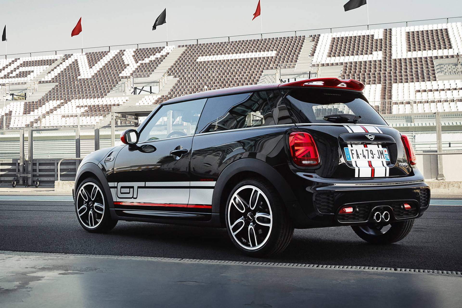 The Cooper S GT Edition will be built in just 150 units and all of them come in Midnight Black with GT accents on the outside. The sides get grey and red stripes while the same motif is applied to the hatch. Red side mirror covers are joined by a similarly painted roof while the front end receives extra headlamps, in typical MINI Rally style. You might also notice that even though this is a Cooper S model underneath, it sports the JCW kit on the outside.