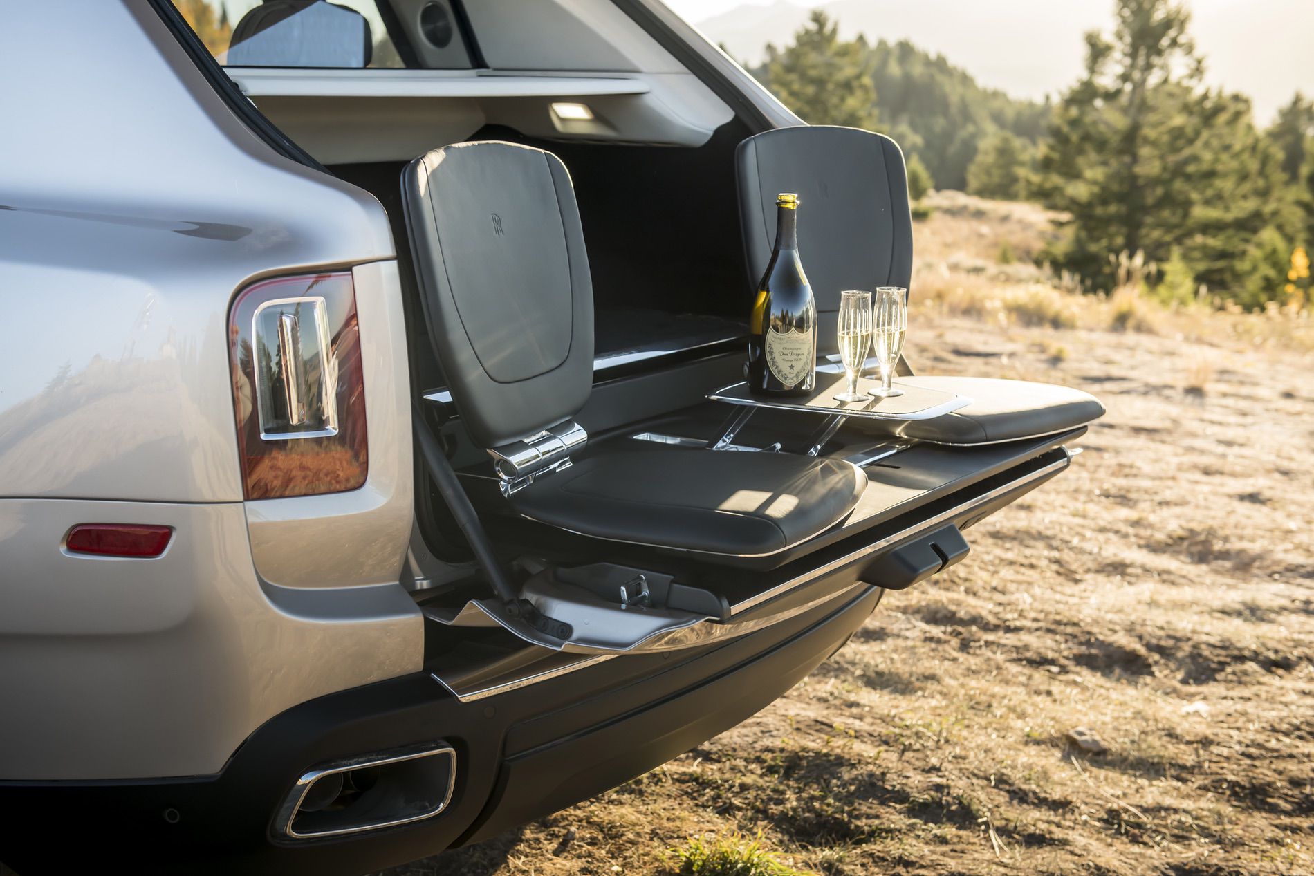 If you decide to choose the Individual Seats for the rear, you get two thrones, separated by a “Fixed Rear Centre Console”, which offers a drinks cabinet filled with whiskey glasses and decanter, as well as champagne flutes and refrigerator.
