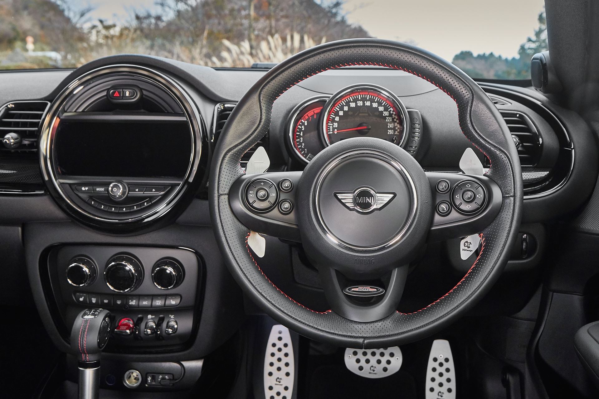 The steering wheel can be augmented with 3D Design aluminum paddles while the same material is used for their pedal covers. They do seem to work quite well with the John Cooper Works steering wheel and overall interior theme, including the checkered flag motif in the speedometer.
