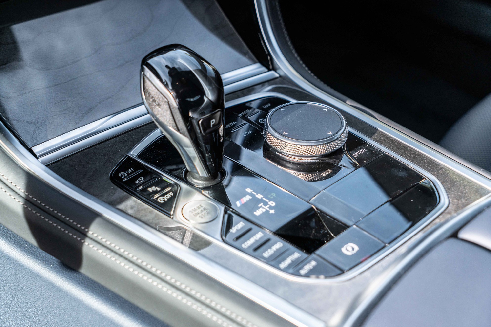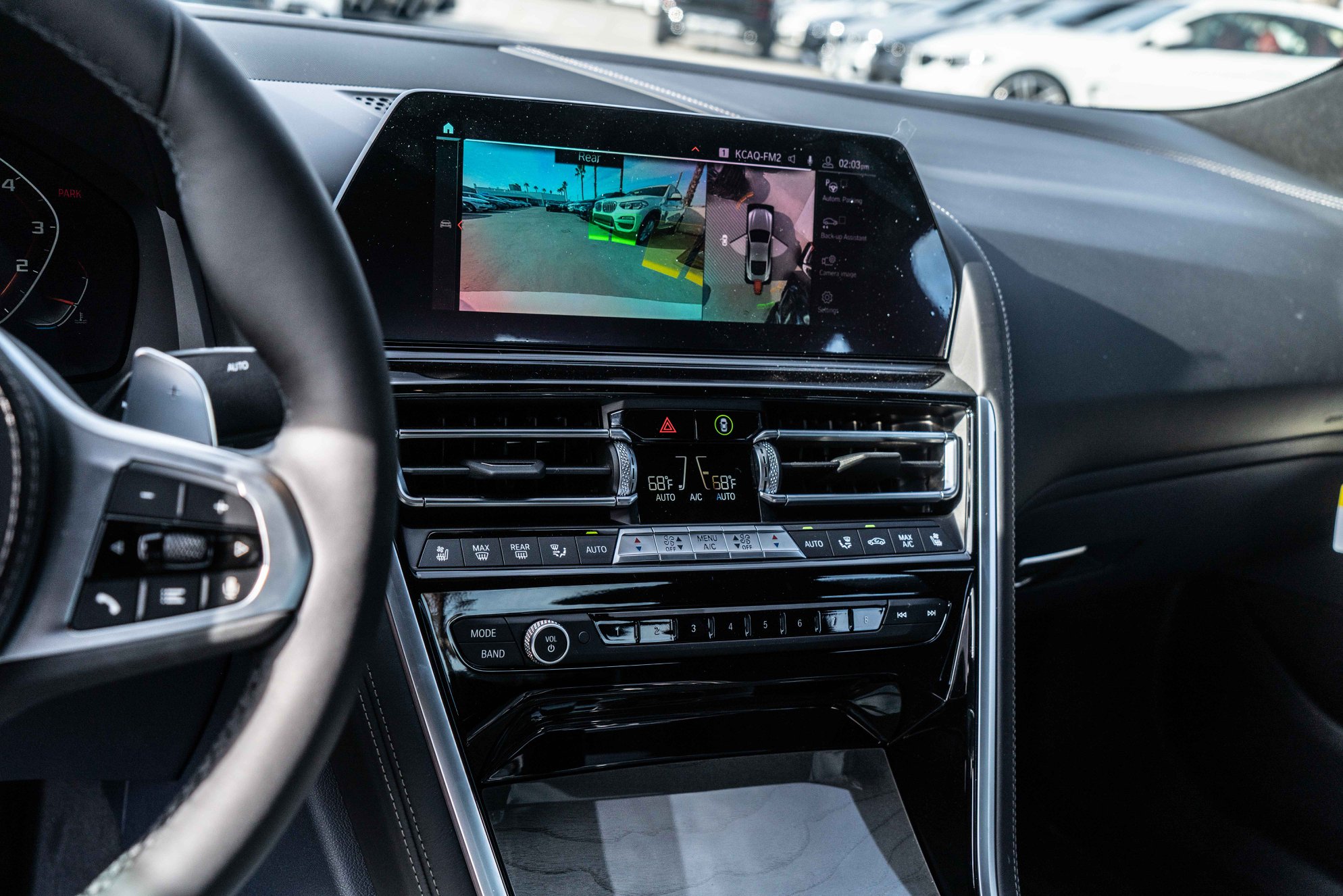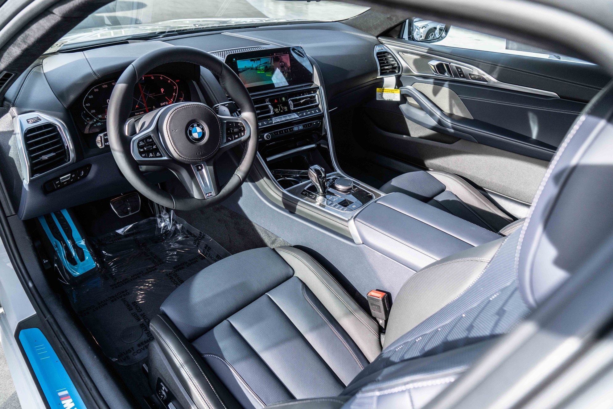 Inside, this Alpine White M850i Coupe features the extended Merino leather interior in Midnight Blue/Black, as well as the interior trim of fine wood Ash Gray. The BMW Live Cockpit Professional with two 12.3-inch displays is standard on all 8 Series and also includes the Head-Up Display.