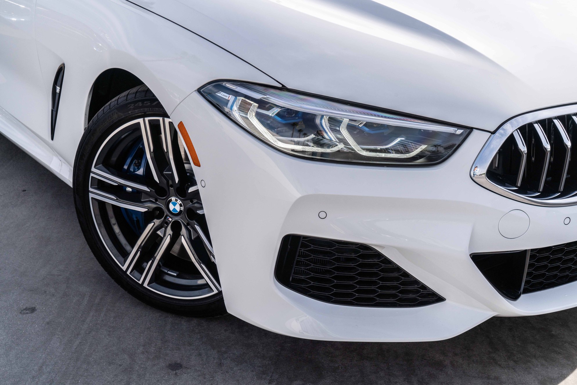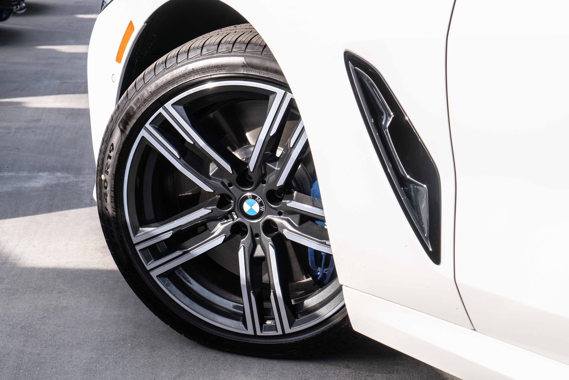 The BMW M850i shown here features the 19-inch M light-alloy wheels 727 M, which are the standard wheel in conjunction with the M Sport package. Behind the wheels we see the blue brake calipers of the M sports brake. A special eye-catcher is the optional M carbon roof.