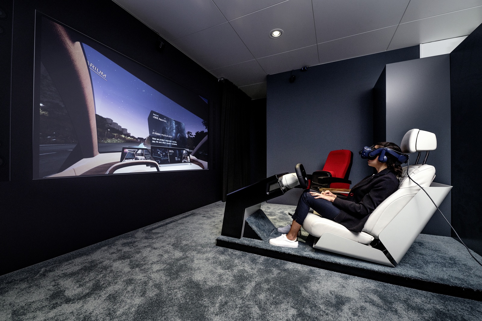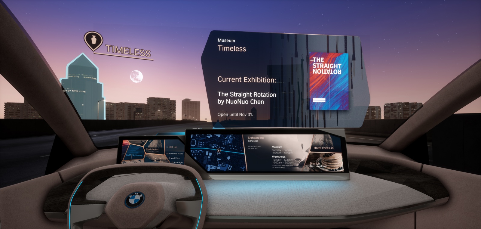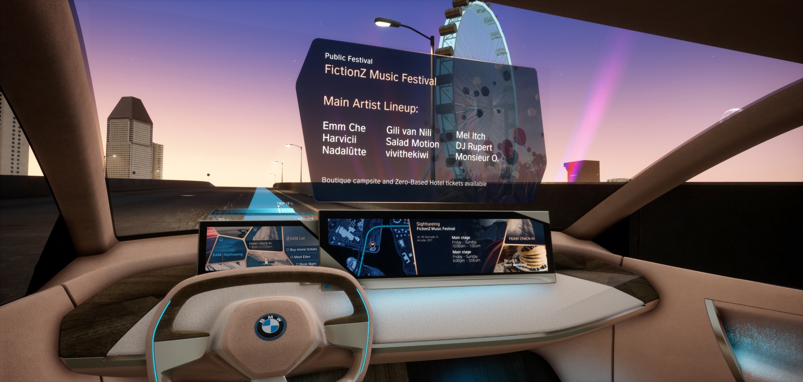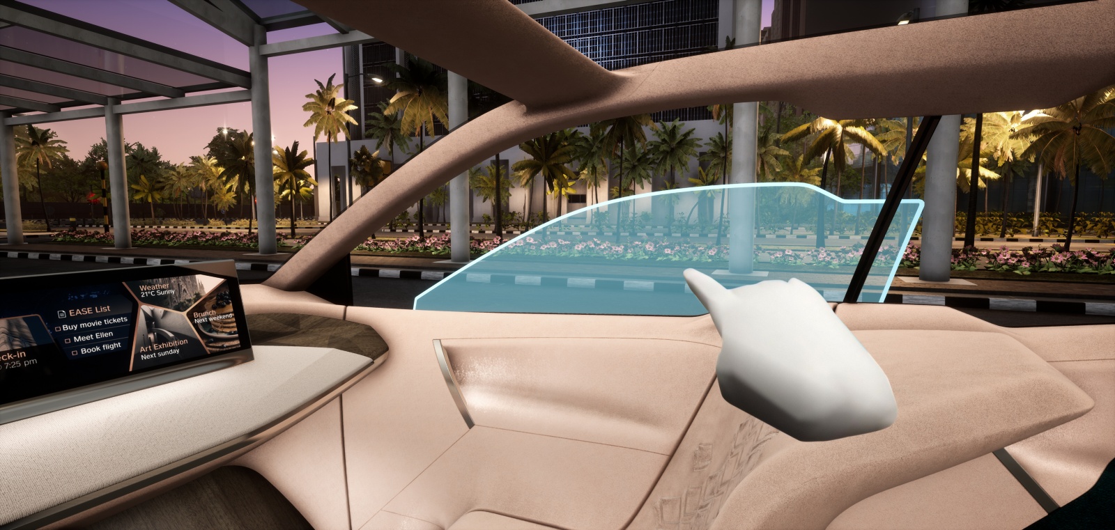 Visitors discover the previously unknown freedom of gesture control throughout the area detected by the gesture camera, which extends across the entire width of the front vehicle interior. Initially, in training mode, directional detection of the pointing gesture is visualised by a dynamic light pulse that follows the direction. Objects the driver can interact with via pointing are then highlighted. Just how natural this interaction is becomes apparent in the simple combination of gesture and language. For example, if the driver points to a side window, this is visually highlighted with a frame and the voice command “Open” will then open the chosen window. These totally new possibilities for interaction with the immediate environment are revealed during an automated journey through a futuristic city the driver is unfamiliar with. The vehicle takes over driving and the visitor embarks on a sightseeing tour of a very different kind – simply pointing at buildings to obtain all the information they need about events and exhibitions. Towards the end of the ride, the user reserves tickets for a cinema they drive by along their route and streams the trailer for the film directly into the vehicle.