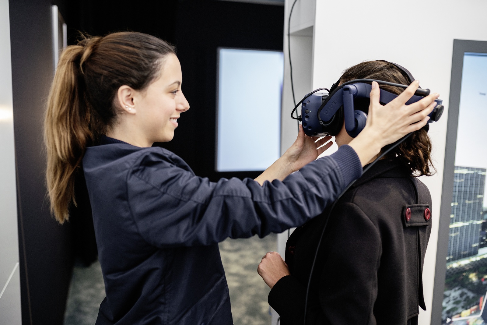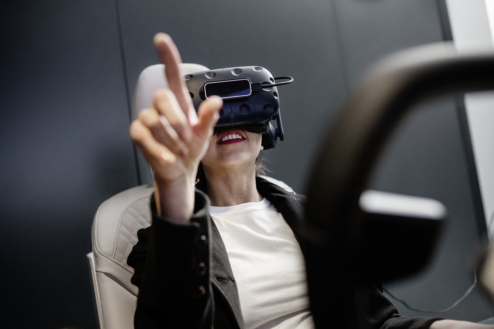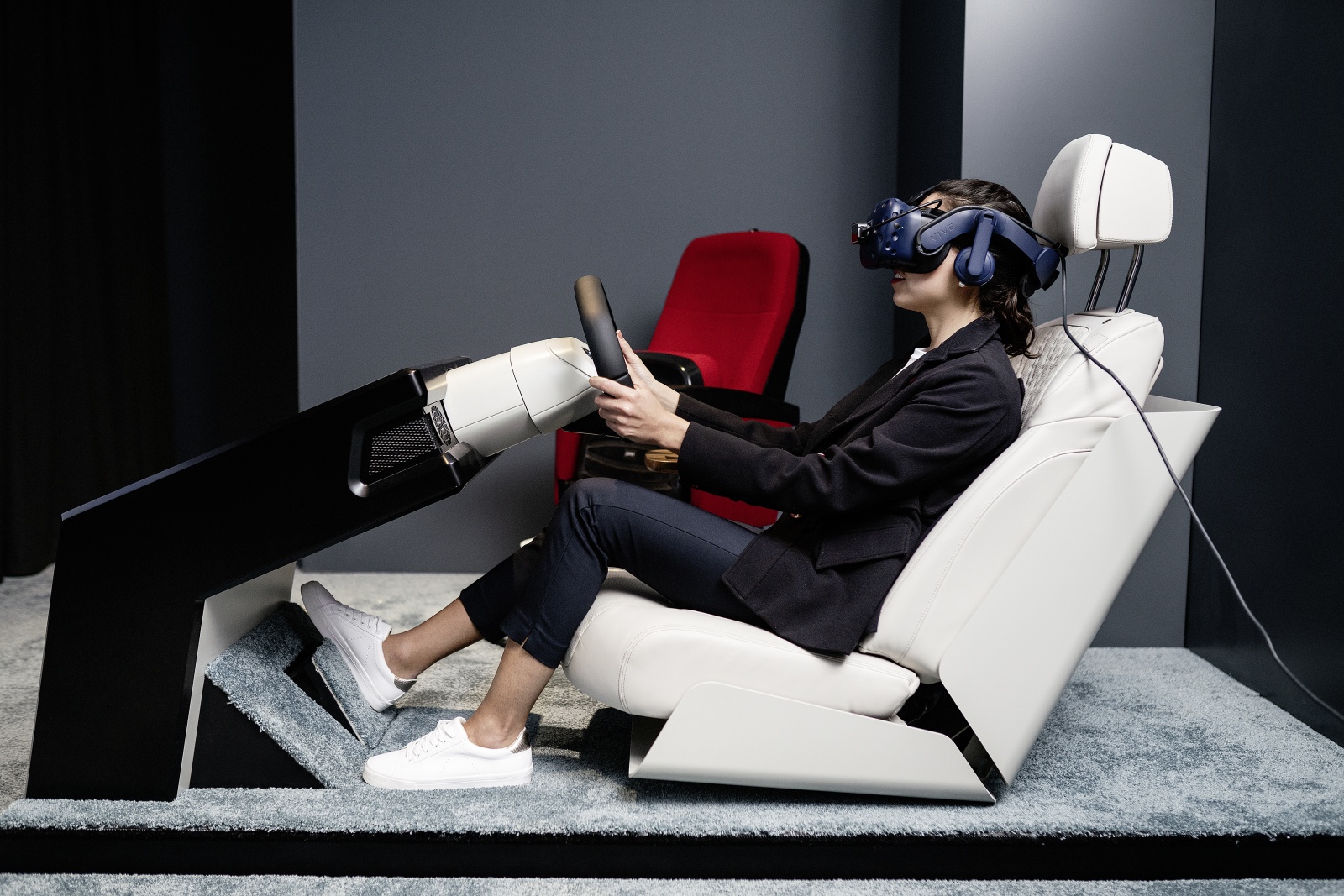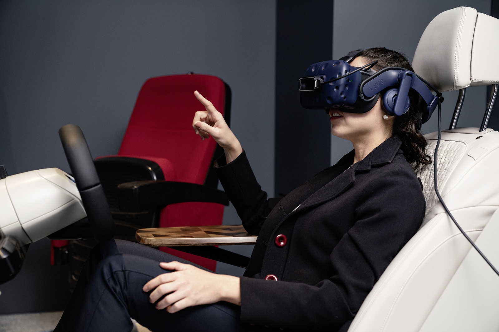 Visitors discover the previously unknown freedom of gesture control throughout the area detected by the gesture camera, which extends across the entire width of the front vehicle interior. Initially, in training mode, directional detection of the pointing gesture is visualised by a dynamic light pulse that follows the direction. Objects the driver can interact with via pointing are then highlighted. Just how natural this interaction is becomes apparent in the simple combination of gesture and language. For example, if the driver points to a side window, this is visually highlighted with a frame and the voice command “Open” will then open the chosen window. These totally new possibilities for interaction with the immediate environment are revealed during an automated journey through a futuristic city the driver is unfamiliar with. The vehicle takes over driving and the visitor embarks on a sightseeing tour of a very different kind – simply pointing at buildings to obtain all the information they need about events and exhibitions. Towards the end of the ride, the user reserves tickets for a cinema they drive by along their route and streams the trailer for the film directly into the vehicle.