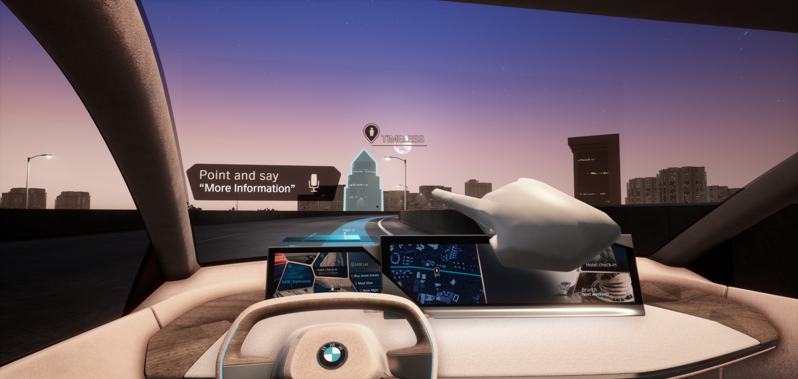 Thanks to intelligent networking, the area of BMW Natural Interaction extends beyond the vehicle interior. For example, the driver can point a finger at objects in their field of vision and give related voice commands, such as asking for information about opening hours or customer ratings, or reserving a table at a restaurant. Thanks to the vehicle’s depth of connectivity, extensive environmental data and artificial intelligence enable BMW Natural Interaction to transform the vehicle into a well-informed, helpful passenger.