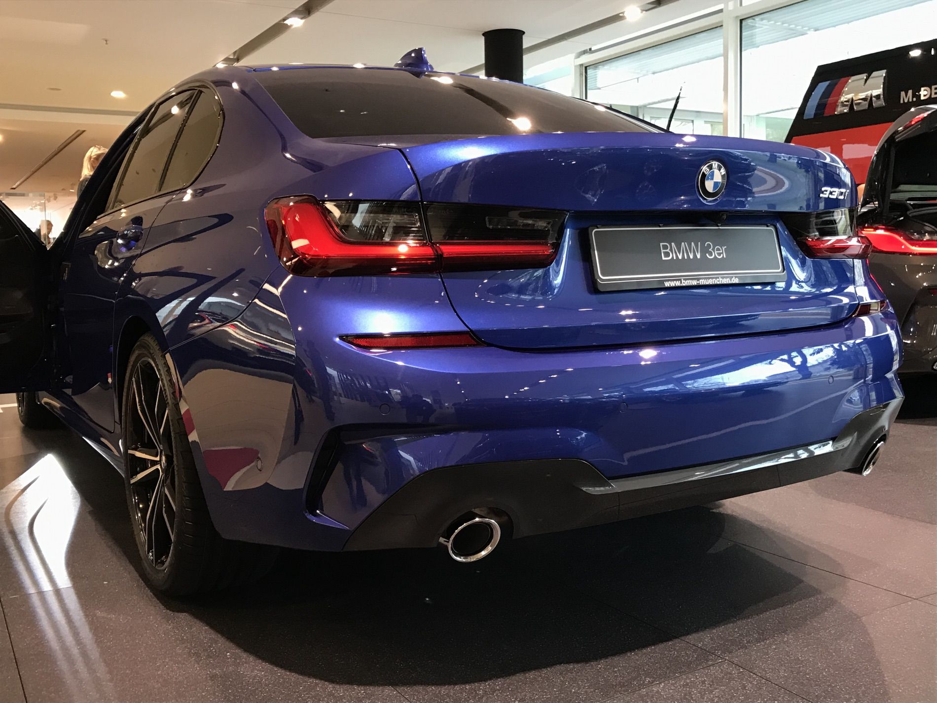 The BMW Niederlassung Munich used two different areas to feature the new BMW 3 Series. A BMW 330i with the M-Sport package featuring the stunning Portimao Blue paint was placed near the main entrance and immediately attracted the attention of the visitors.