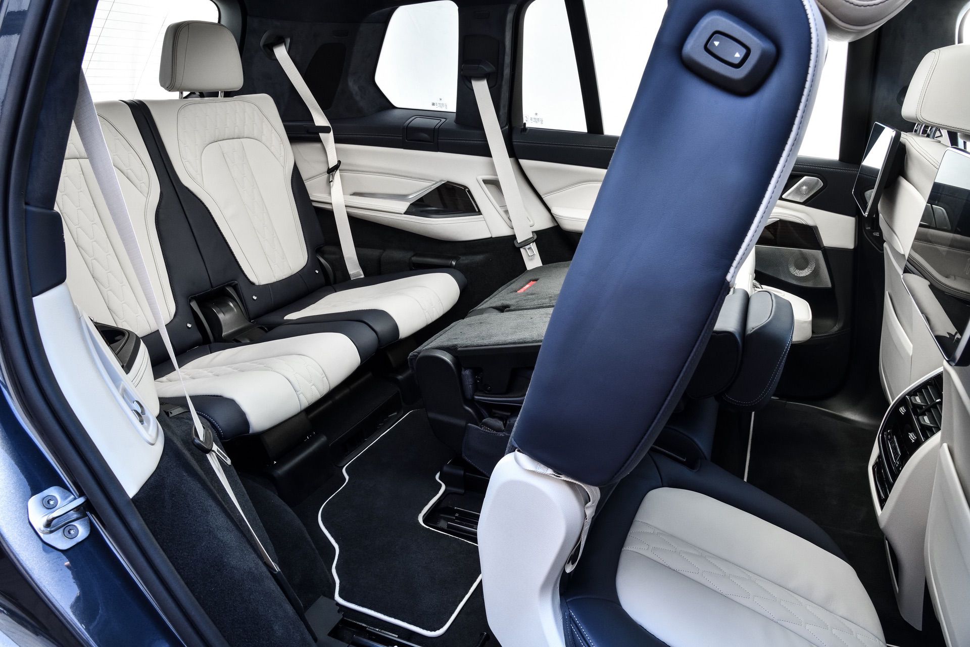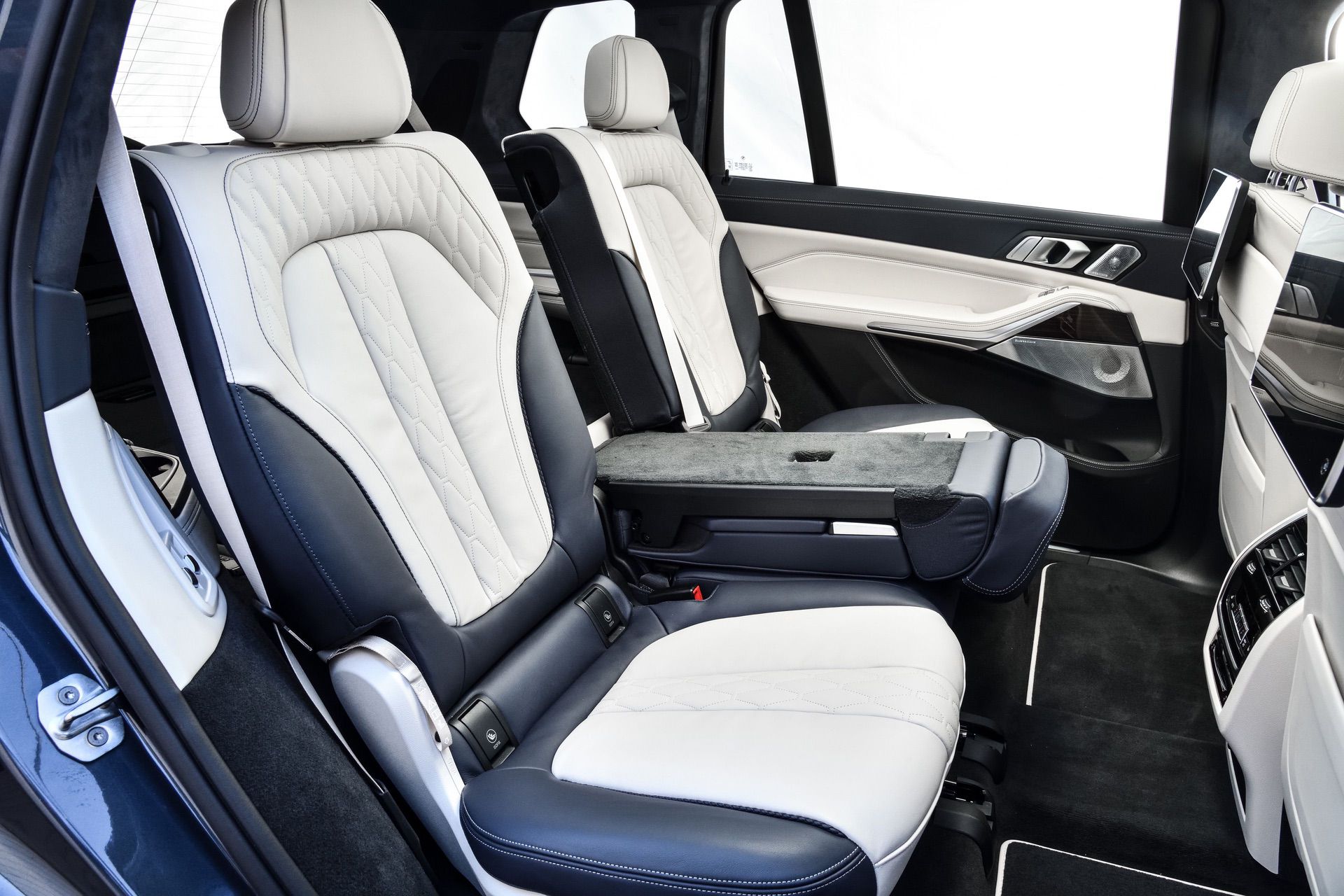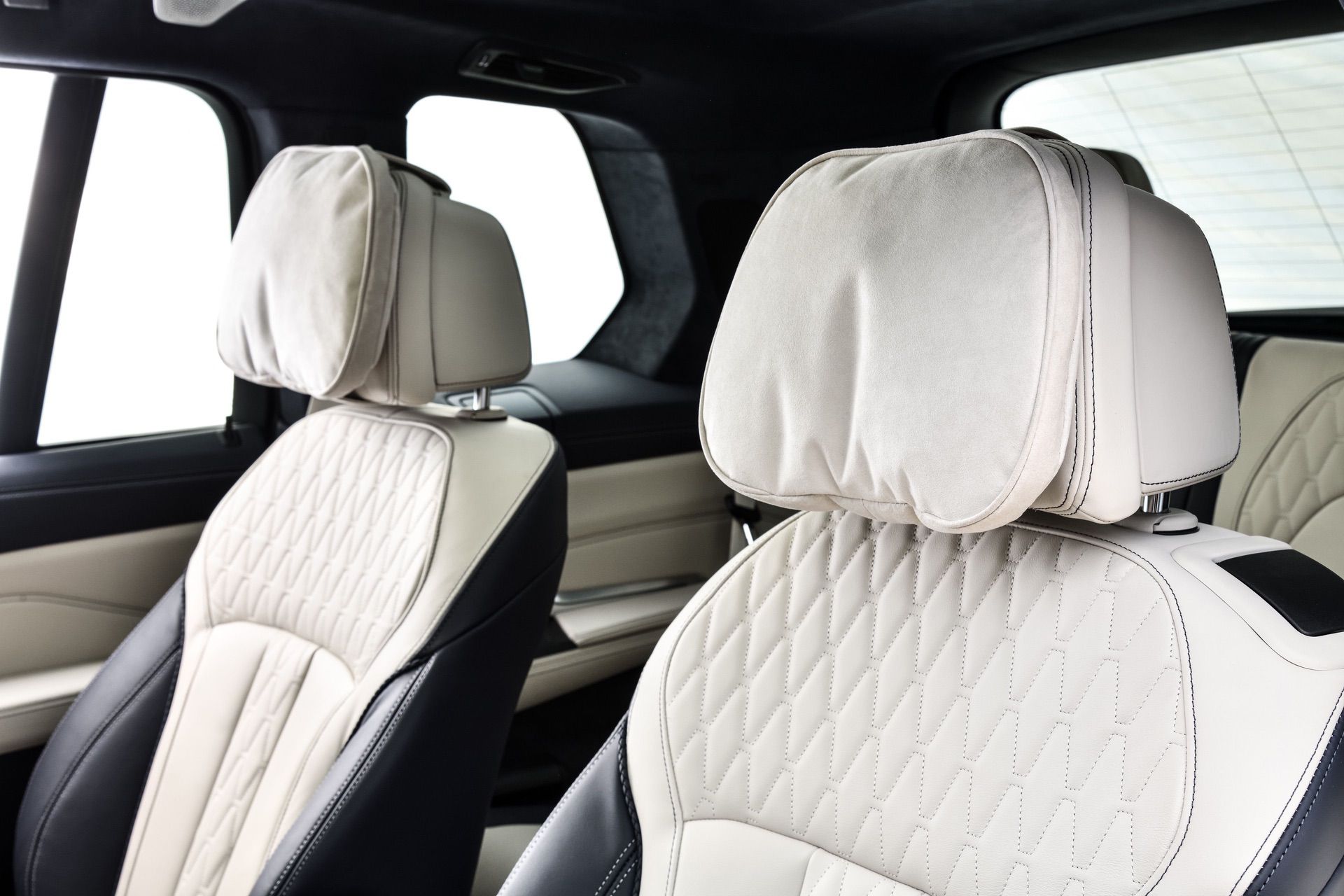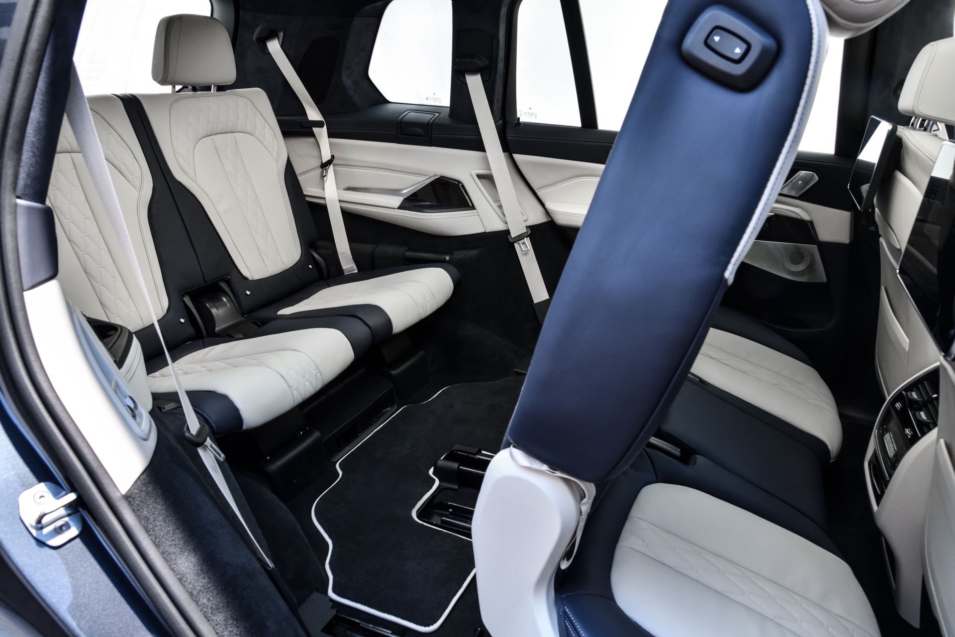 Inside, you’re getting a variation of different upholsteries – SensaTec Black, nine premium Vernasca and Extended Merino Leathers (in the X7 xDrive40i for the US market). The two-tone Ivory White/Navy Blue Full Leather Merino interior, with a Navy Blue leather dashboard and a Navy Blue Alcantara headliner, can be specified for some models. More on that particular combination in our next BMW X7 article.