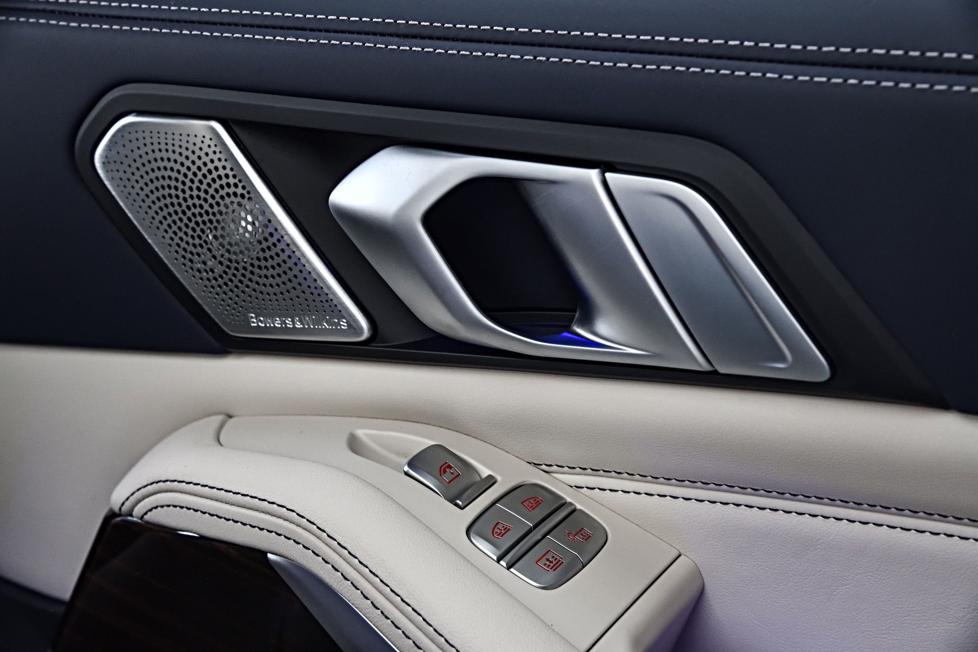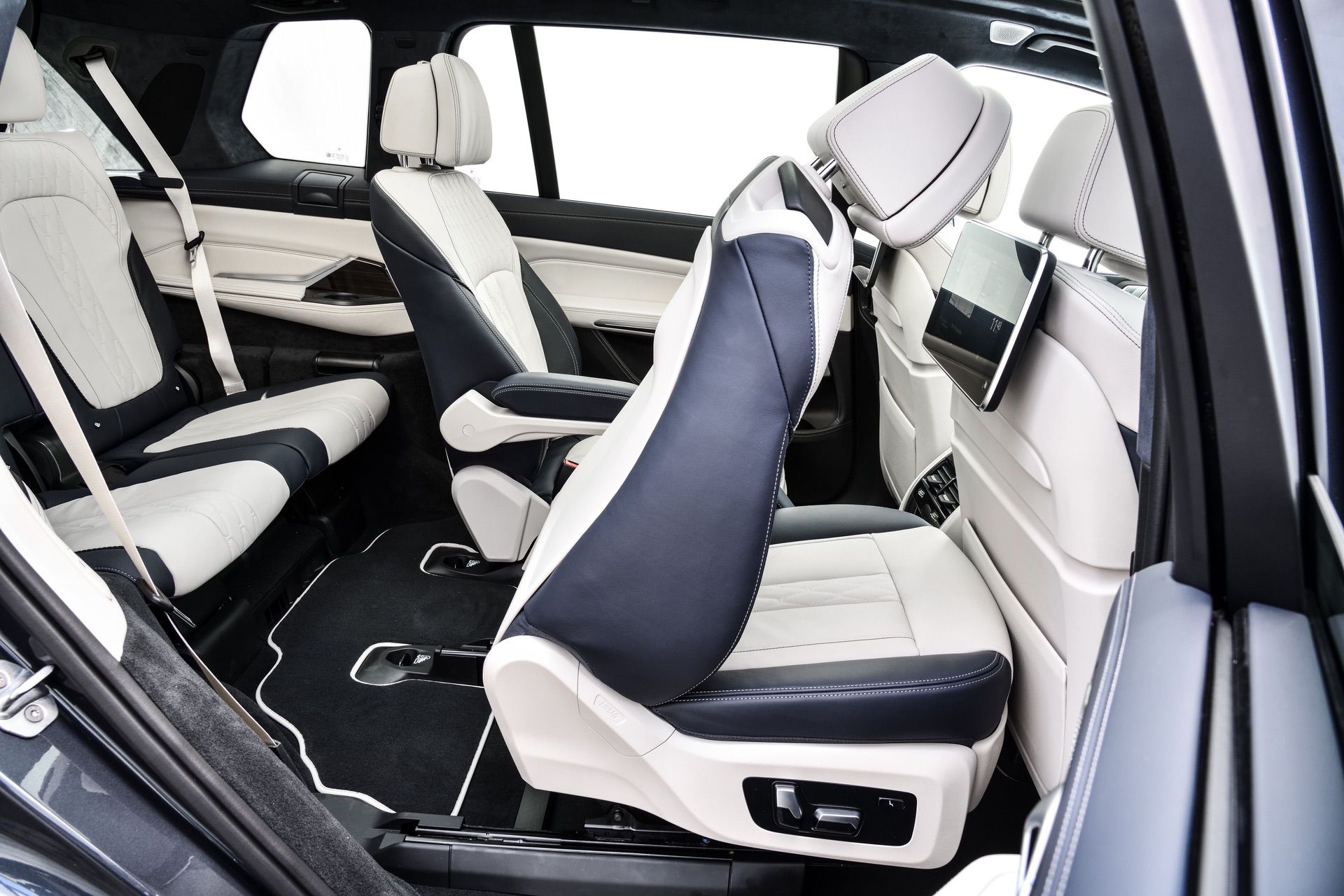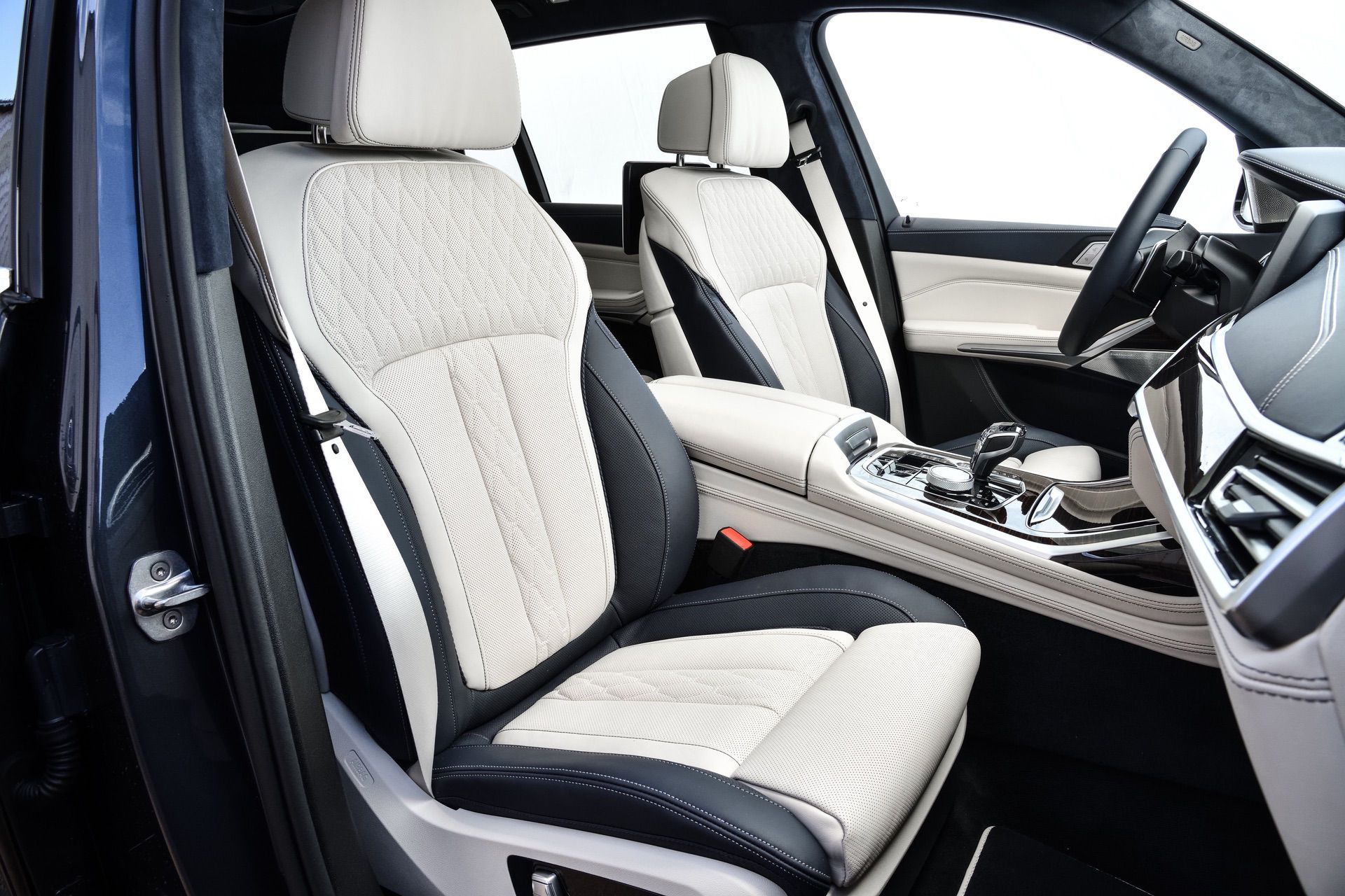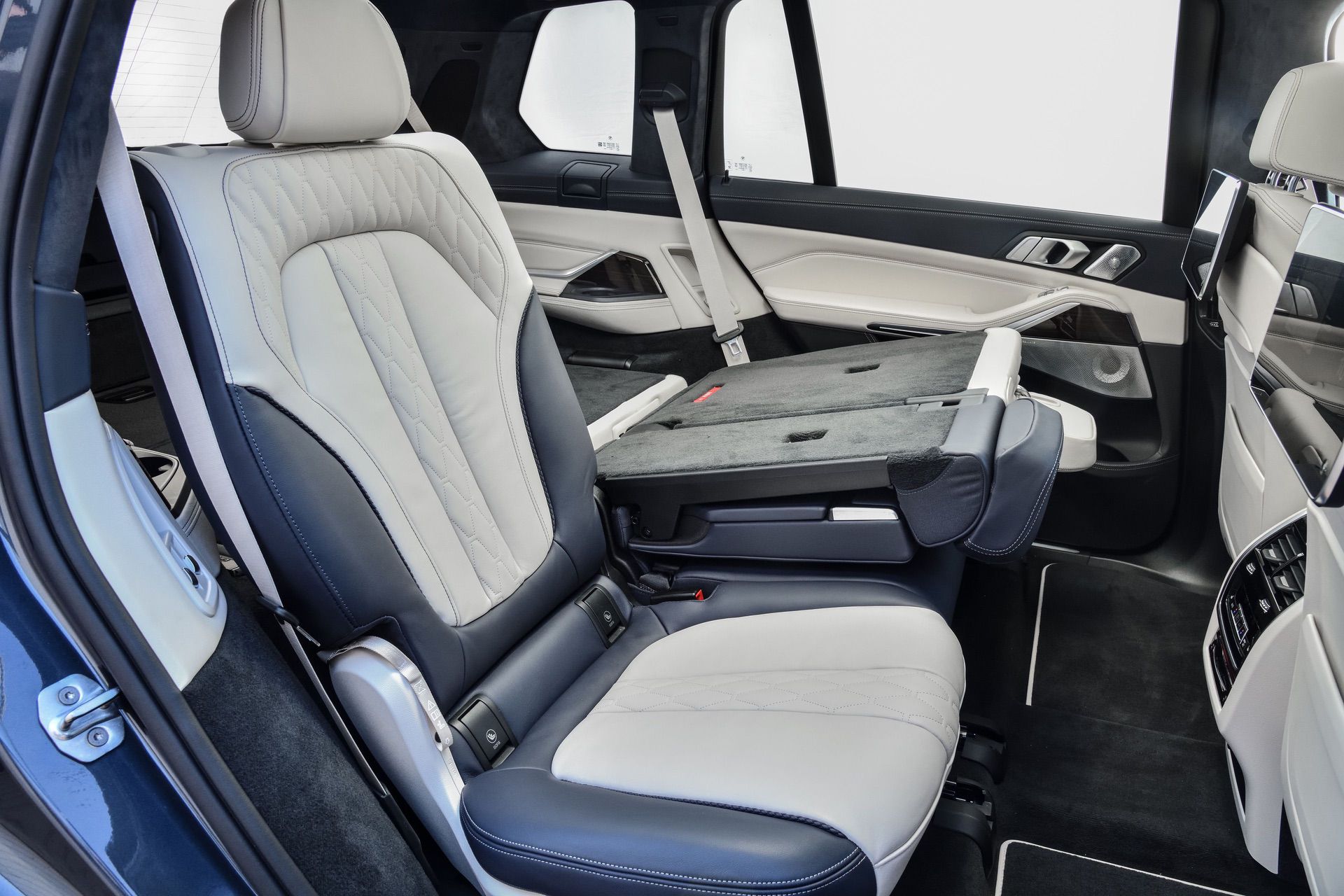 Inside, you’re getting a variation of different upholsteries – SensaTec Black, nine premium Vernasca and Extended Merino Leathers (in the X7 xDrive40i for the US market). The two-tone Ivory White/Navy Blue Full Leather Merino interior, with a Navy Blue leather dashboard and a Navy Blue Alcantara headliner, can be specified for some models. More on that particular combination in our next BMW X7 article.