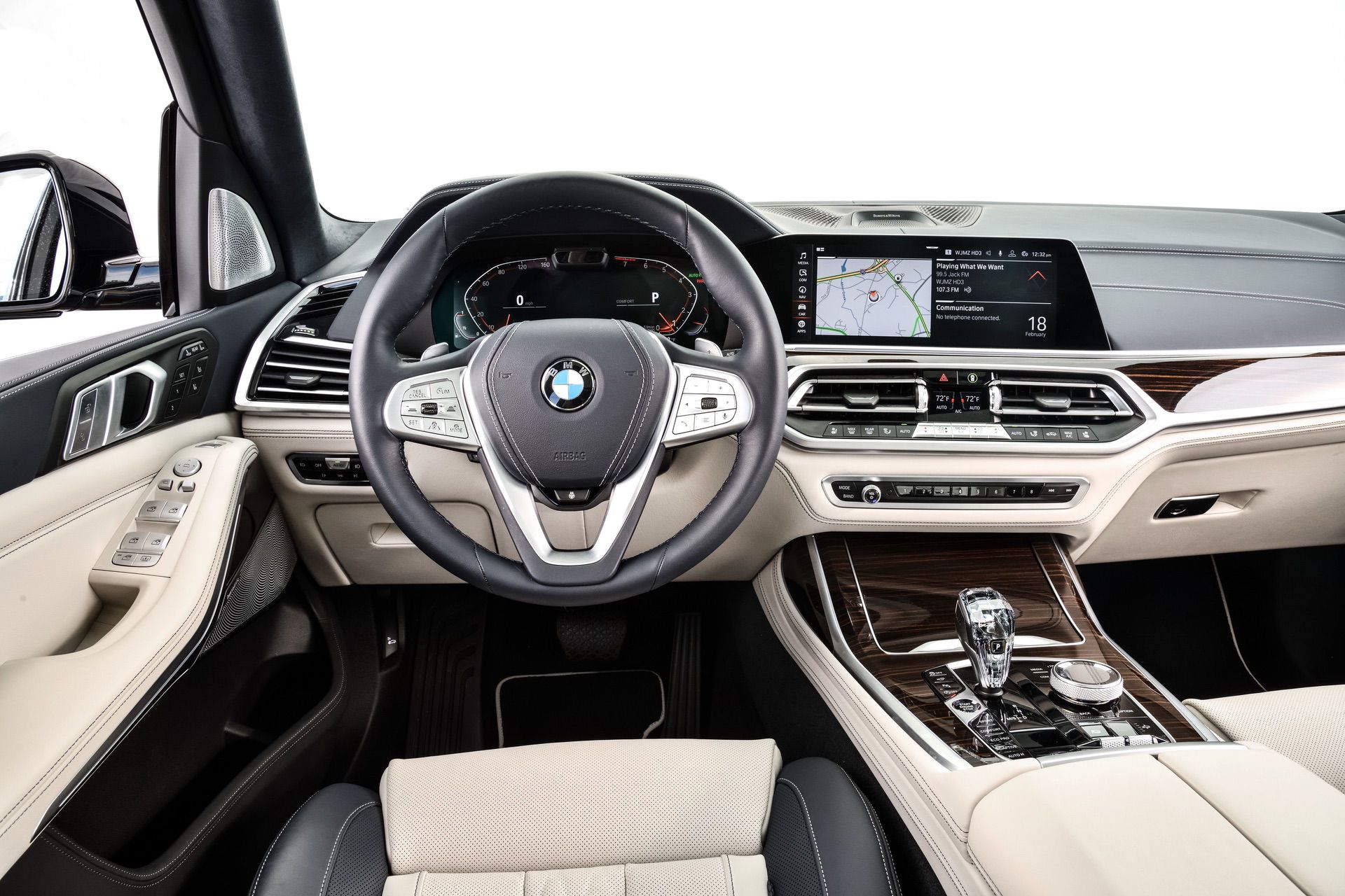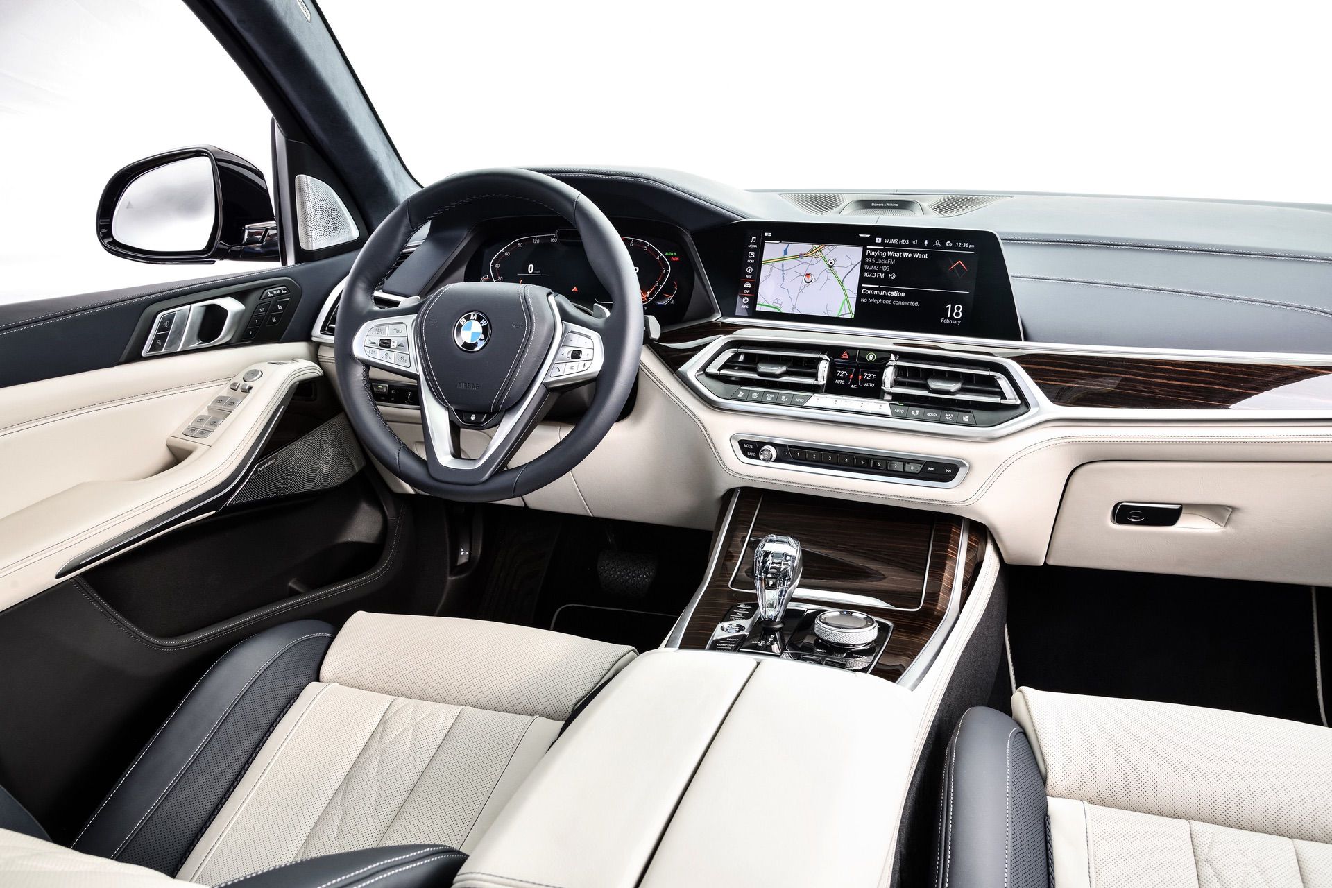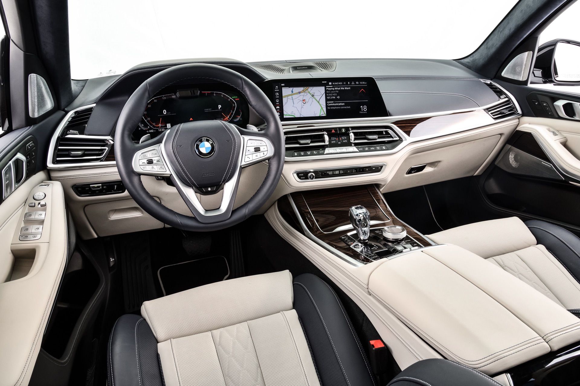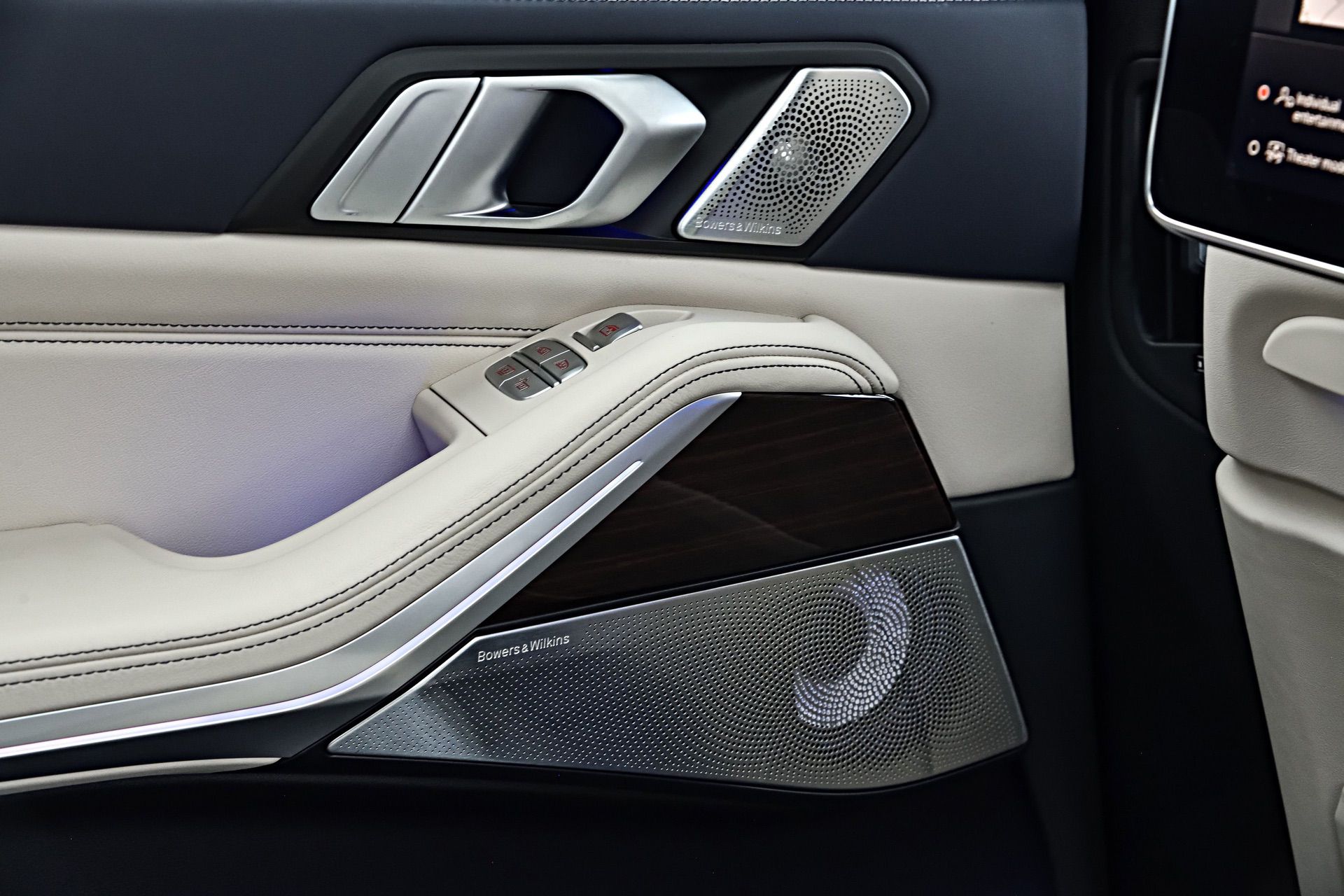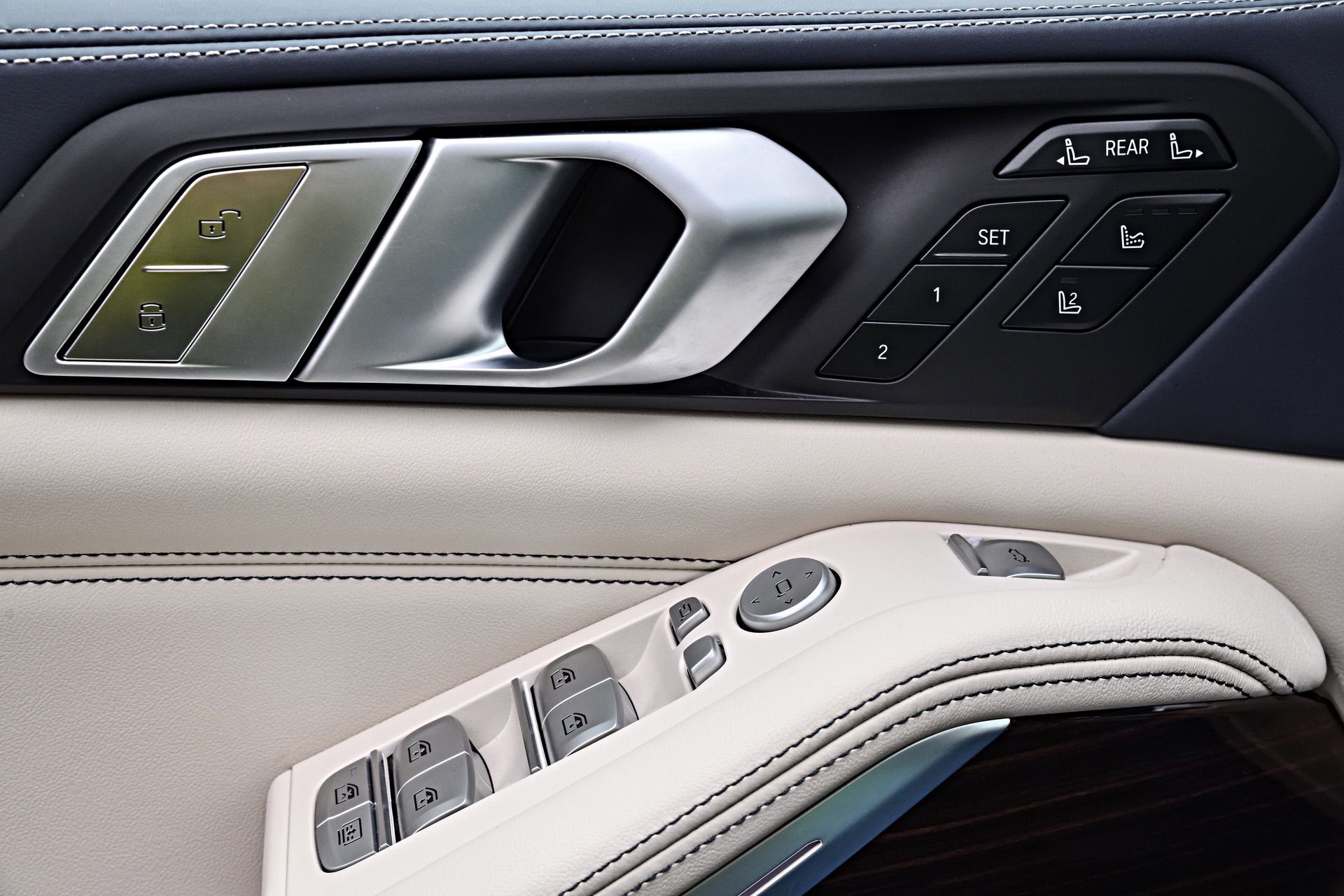 Inside, you’re getting a variation of different upholsteries – SensaTec Black, nine premium Vernasca and Extended Merino Leathers (in the X7 xDrive40i for the US market). The two-tone Ivory White/Navy Blue Full Leather Merino interior, with a Navy Blue leather dashboard and a Navy Blue Alcantara headliner, can be specified for some models. More on that particular combination in our next BMW X7 article.