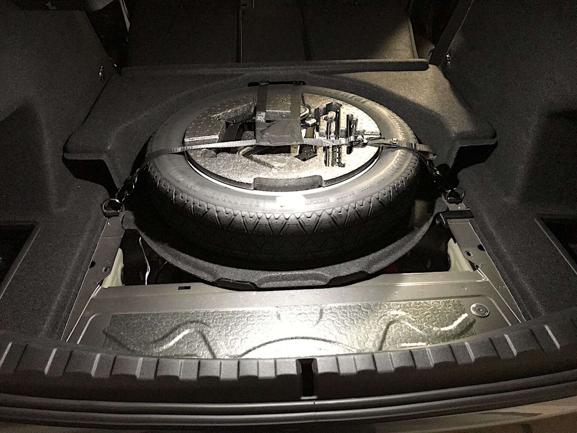 Spacing-saver spare enclosure raised 4.5″ above trunk floor. There is 14.5″ in height from space-saver spare liner to the ceiling of the trunk. If trunk space is an absolute requirement, remove the space-saver spare enclosure entirely, and place the OEM trunk liner (Part Number: 51477438290) on trunk floor to restore trunk space. The original space-saver spare liner won’t sit flush on trunk floor after removing the tire enclosure. For day-to-day use, the trunk space is plenty even with space-saver spare enclosure in place. One possible future update could be flat tire gel pack similar to M model.