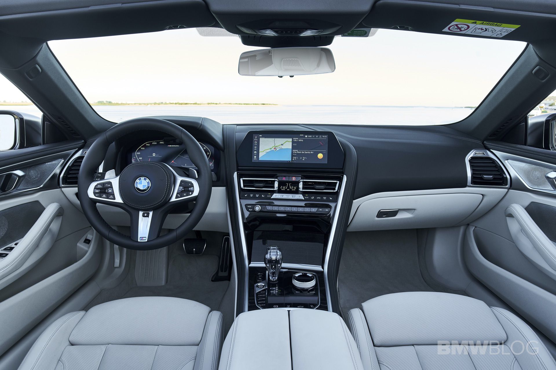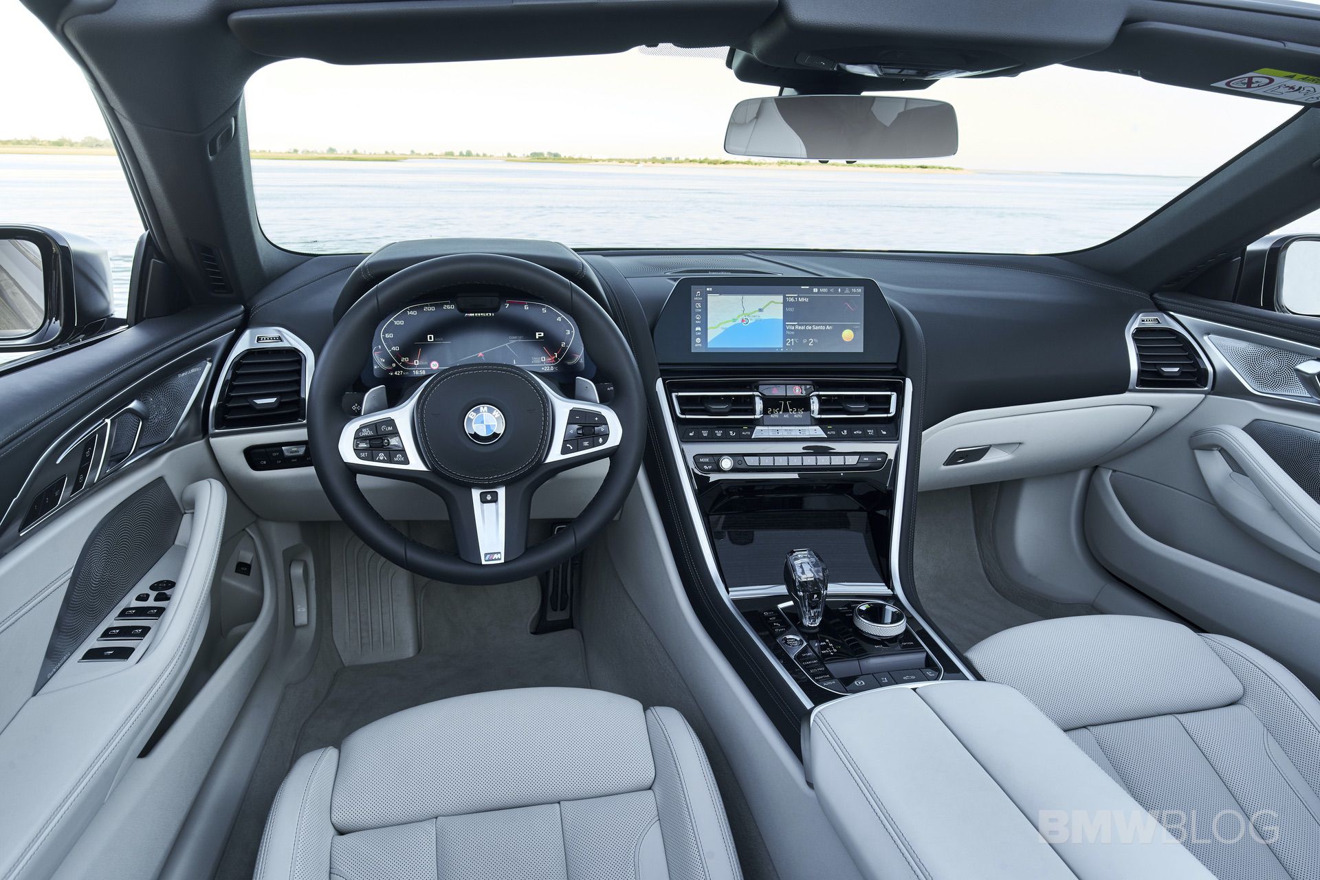 Climbing behind the wheel is quite a treat; the convertible welcomes you with a premium cabin which inherits almost of all its elements from the coupe. The Merino leather of the front seats in Ivory White is superb and of the highest quality, and when paired with the fine-wood trim ‘Fineline’ copper effect high-gloss, the experience becomes even more premium for the driver. The tech also comes from the coupe-brother, so you’re getting the same dual 12.3 inch screens, paired with the Glass Application in the M850i, and an M Sports steering wheel.